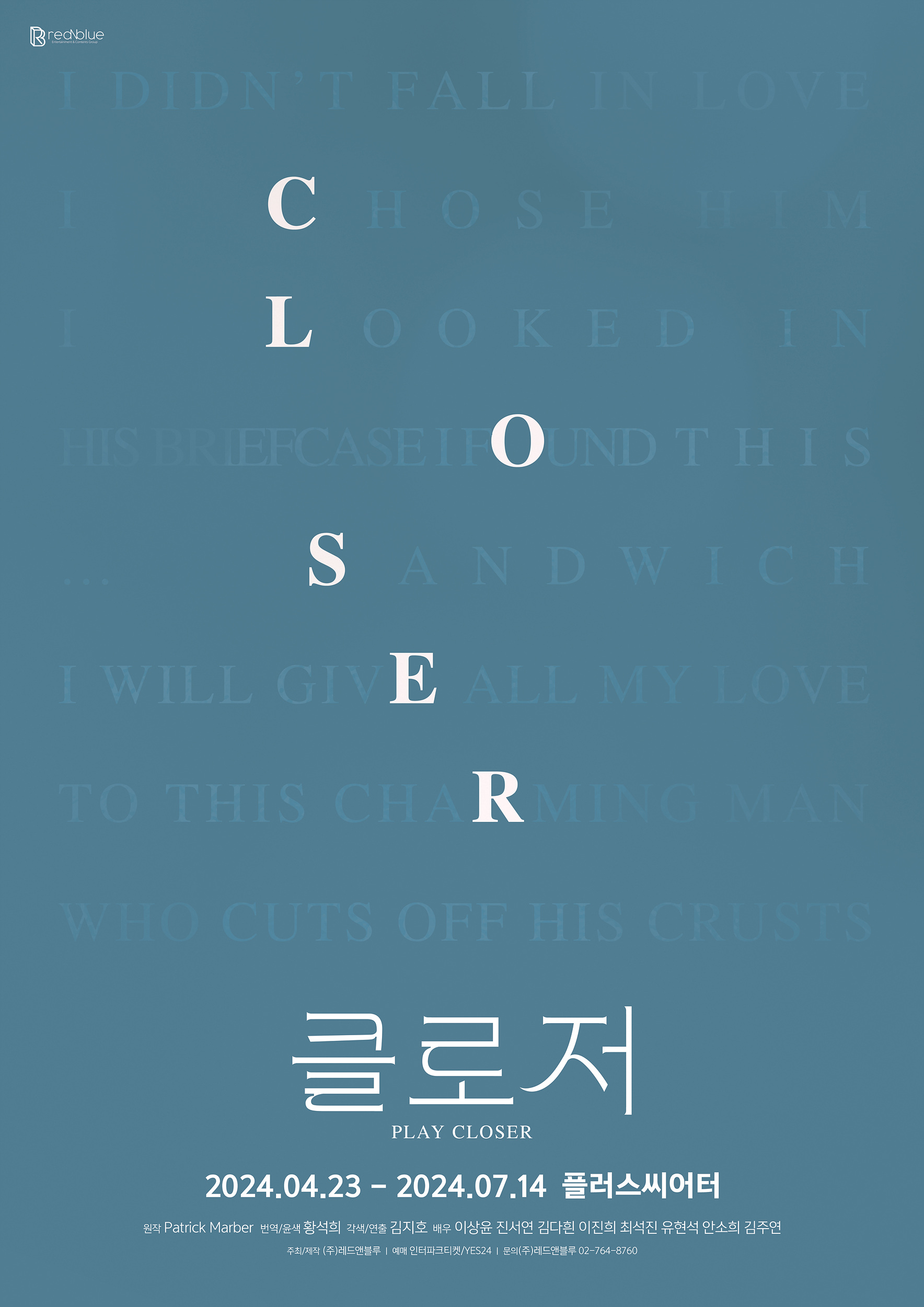 연극 '클로저'는 현대 런던을 배경으로 앨리스, 댄, 안나, 래리라는 네 명의 남녀가 만나 서로의 삶에 얽혀 드는 과정을 좇는 작품이다. 사랑에 빠지고 그 사랑이 끝나는 과정에서 서로를 향해 품는 열망과 집착, 흔들리는 마음, 소통과 진실의 중요성을 조명한다.