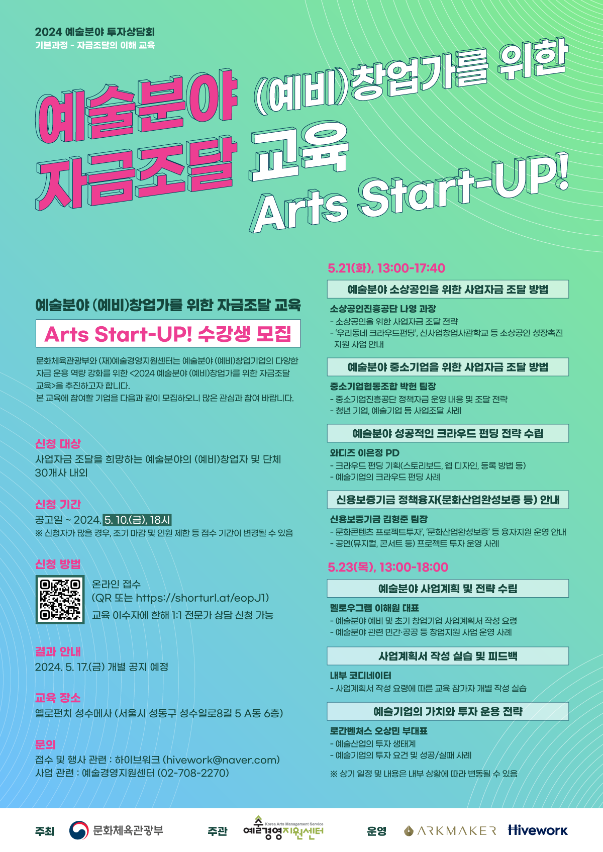 [플레이뉴스 문성식기자] 문화체육관광부(장관 유인촌, 이하 문체부)와 예술경영지원센터는 ‘예술분야 (예비)창업가를 위한 자금조달 교육 ‘Arts Start-UP!’’에 참여할 예술기업 및 단체, 예비 창업자 등 30개사를 모집한다고 밝혔다.