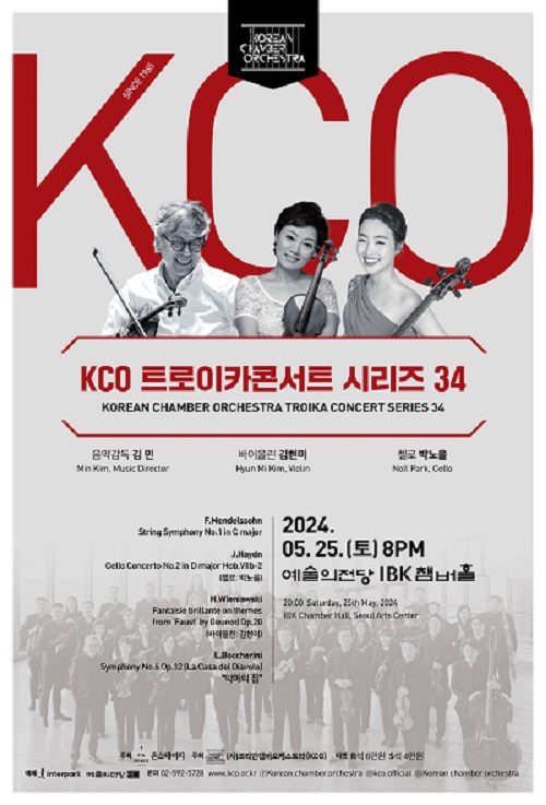[플레이뉴스 문성식기자] 오는 5월 25일 토요일 오후 8시, 예술의전당 IBK챔버홀에서 2012년부터 시작되어 뛰어난 연주 실력을 겸비한 연주자들을 널리 알리는 취지로 기획된 코리안챔버오케스트라의 '트로이카 콘서트 시리즈'의 34번째 공연이 이루어진다. 이날 공연은 한국을 대표하는 바이올리니스트 김현미 와 첼리스트 박노을이 협연자로 무대에 선다.