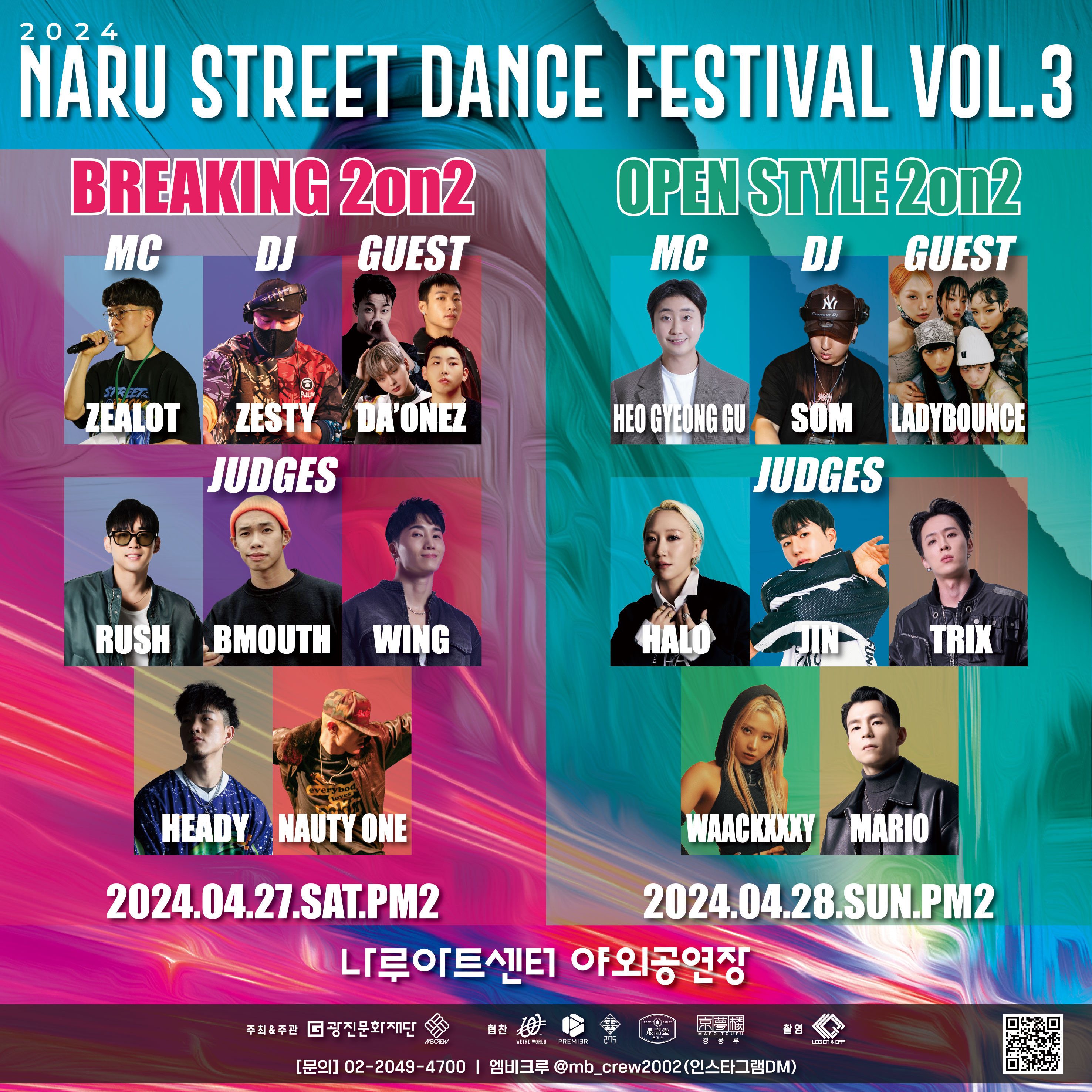 ‣ 공 연 명 : 2024 나루 스트릿 댄스 페스티벌 ‣ 공연일시 : 2024. 4. 27(토) / 2024. 4. 28(일) 14:00 ‣ 공연장소 : 나루아트센터 야외공연장 ‣ 주최/주관 : (재)광진문화재단, 엠비크루 ‣ 관람연령 : 전 연령 ‣ 입 장 권 : 무 료 ‣ 관람문의 : 02-2049-4700 |