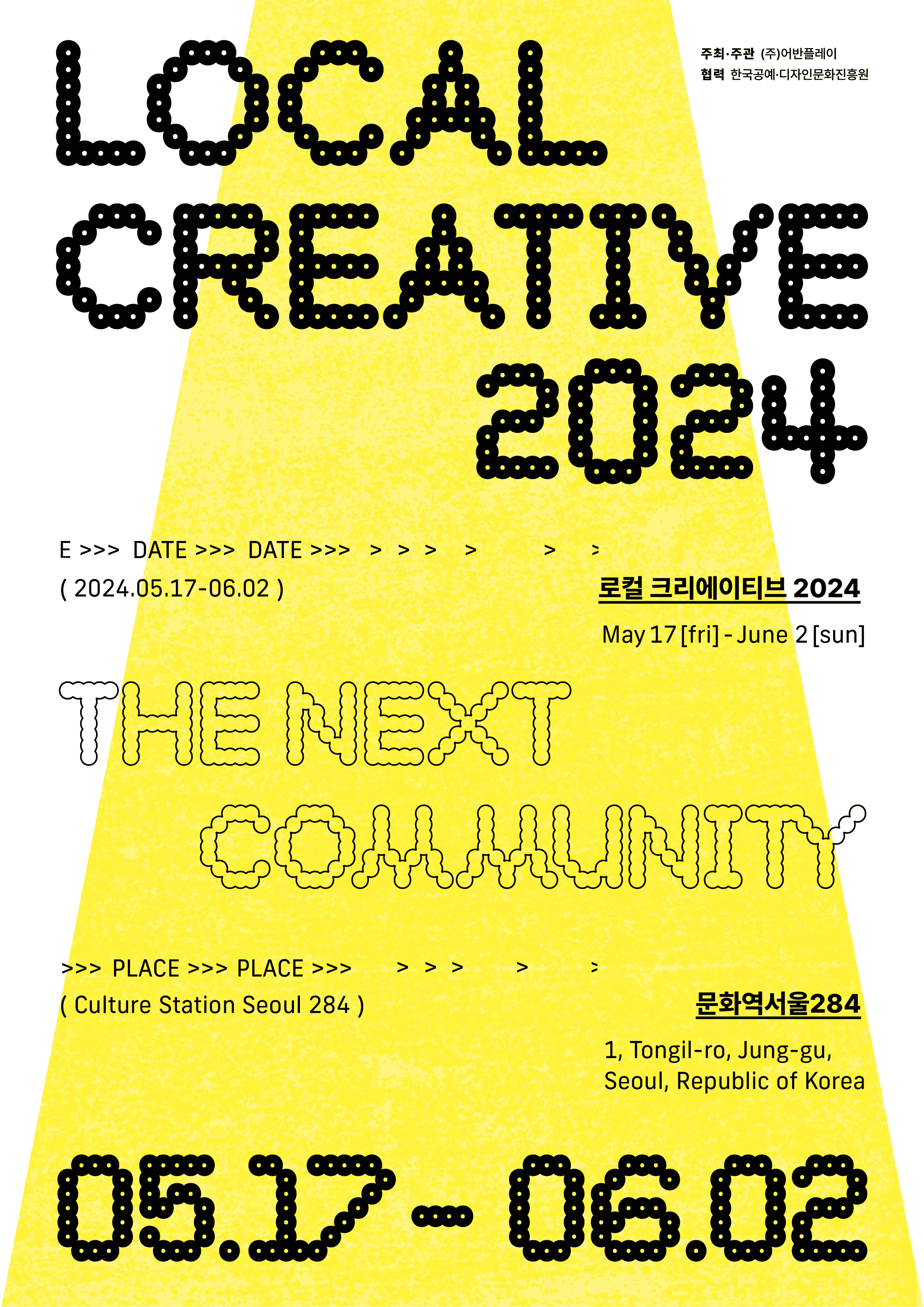 [플레이뉴스 문성식기자] 한국공예·디자인문화진흥원(원장 장동광, 이하 공진원)은 어반플레이(대표 홍주석)와 협력하여 오는 5월 17일부터 6월 2일까지 문화역서울284에서 《로컬 크리에이티브 2024: The Next Community》를 선보인다.