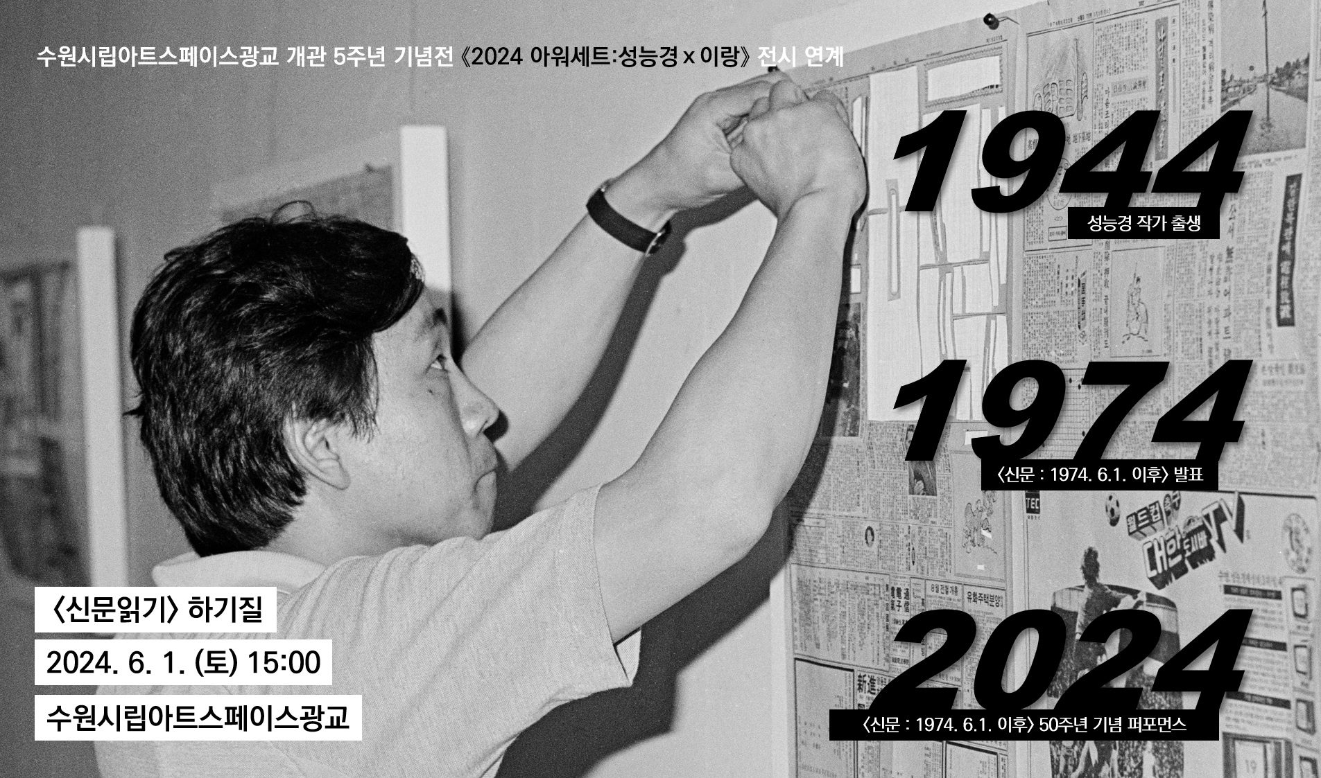 특히 올해는 성능경의 대표작인 '신문 : 1974. 6. 1. 이후' (1974)의 작품 발표 50주년으로 이를 기념해 작가와 관람객이 퍼포머로 참여하는 '신문읽기' 단체 퍼포먼스를 개최한다. 반세기 전, 유신 시대에 언론의 역할에 대해 질문했던 '신문읽기'는 종이신문이 사라져가는 21세기 정보 미디어의 변화에 또 다른 질문을 남긴다.