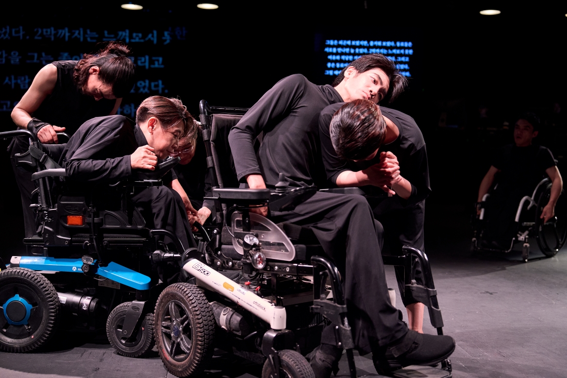 관객은 대사 뿐만 아니라, 다양한 높낮이의 객석에서 배우들이 걷거나 바닥을 구르고, 휠체어 바퀴의 움직임들을 감각할 수 있다. 또한 희곡의 ‘무대’ 말과 지문 등이 무대음성을 맡은 배우의 목소리로 실시간 발화되며, 무대와 배우, 무대와 객석은 서로의 존재를 ‘인정’하게 된다.