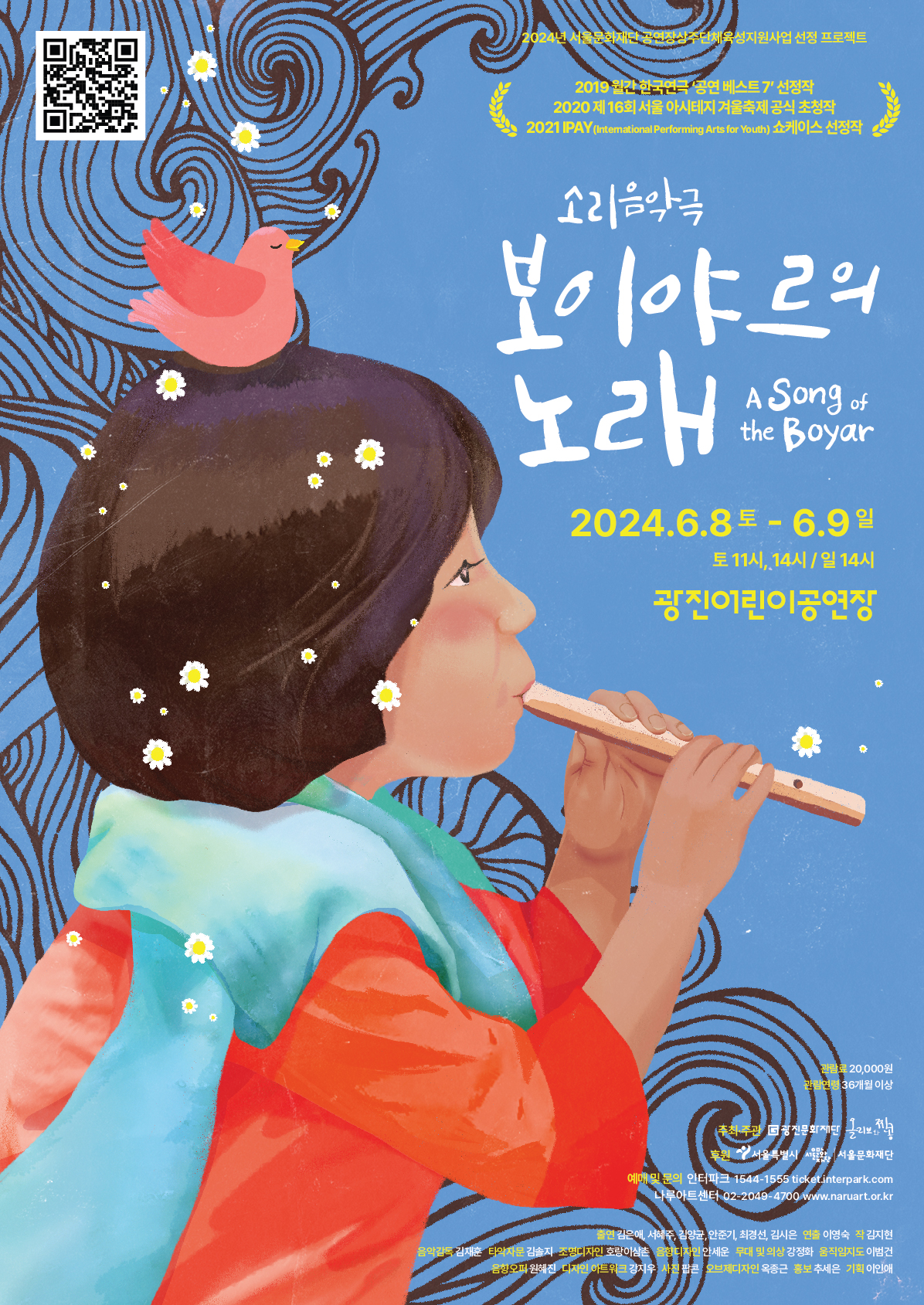 ‣ 공 연 명 : 소리음악극 '보이야르의 노래' ‣ 공연일시 : 2024. 6. 8(토) ~ 2024. 6. 9(일) ※ 토요일 11시, 14시 / 일요일 14시 ‣ 공연장소 : 광진어린이공연장 ‣ 주최/주관 : (재)광진문화재단, 올리브와 찐콩 ‣ 소요시간 : 60분 ‣ 입장연령 : 만 36개월 이상 ‣ 입 장 권 : 전석 20,000원 ‣ 예약문의 : 02-2049-4700 |
