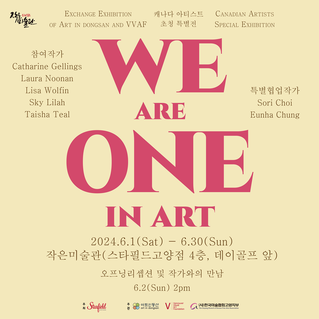미술작품을 매개체로 양국의 문화를 알리며 친선을 도모하는 "우리는 하나(We are one in art)" 행사가 2024년 6월 1일(토) ~ 6월 30일(일)까지 스타필드고양점 4층(점장 김형인) 작은미술관에서 진행 중으로 아트인동산과 밴쿠버 비주얼 아트 재단(VVAF)이 공동 주관으로 실시되고 있다.