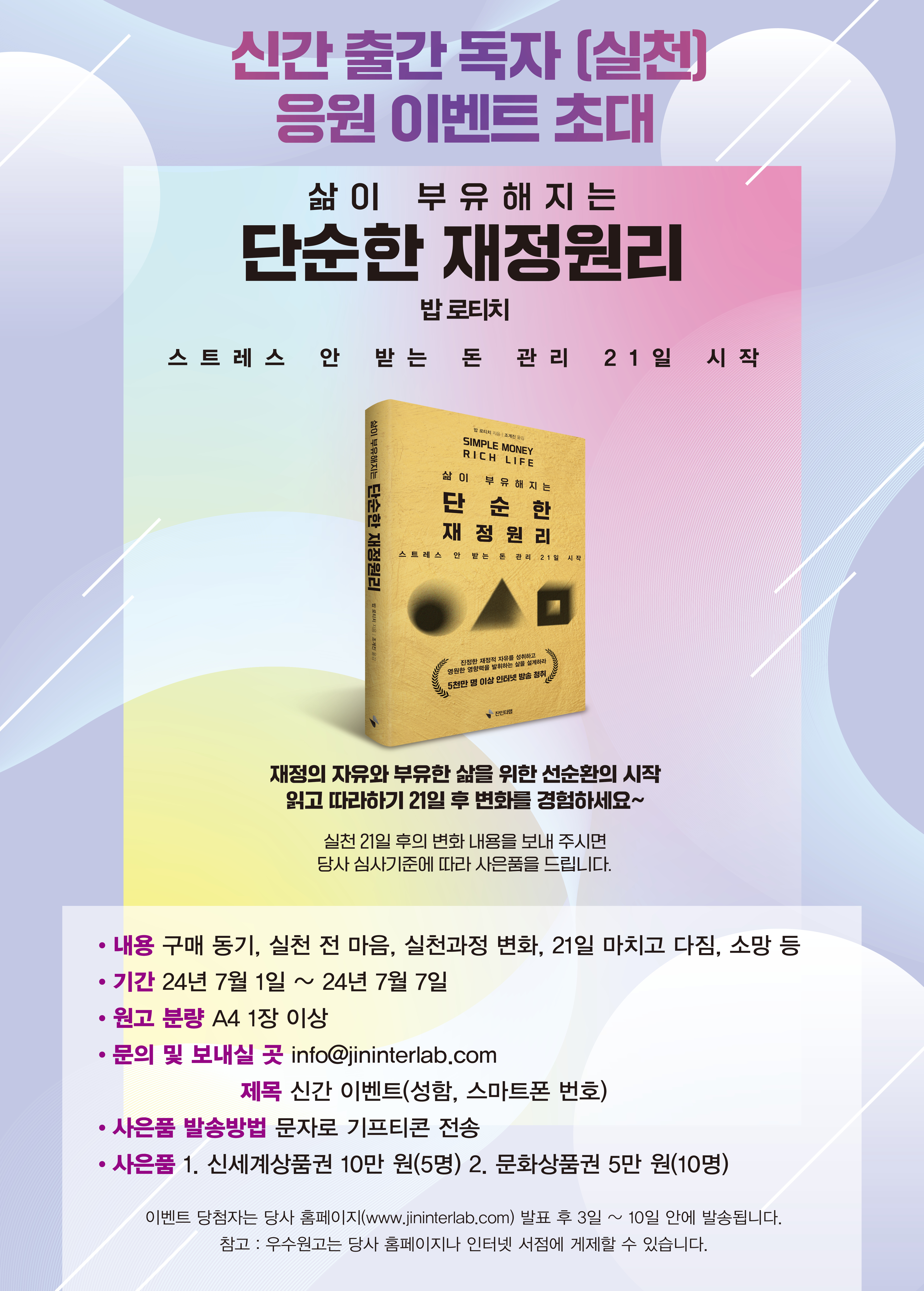 이 책에서 다루는 재정 원리는 단순하다. 그러나 저자가 15년간 스스로 실천하고 수많은 사람들의 피드백을 받으면서 정립한 원리이기 때문에 삶이 부유해지는 강력한 영향력이 있다.