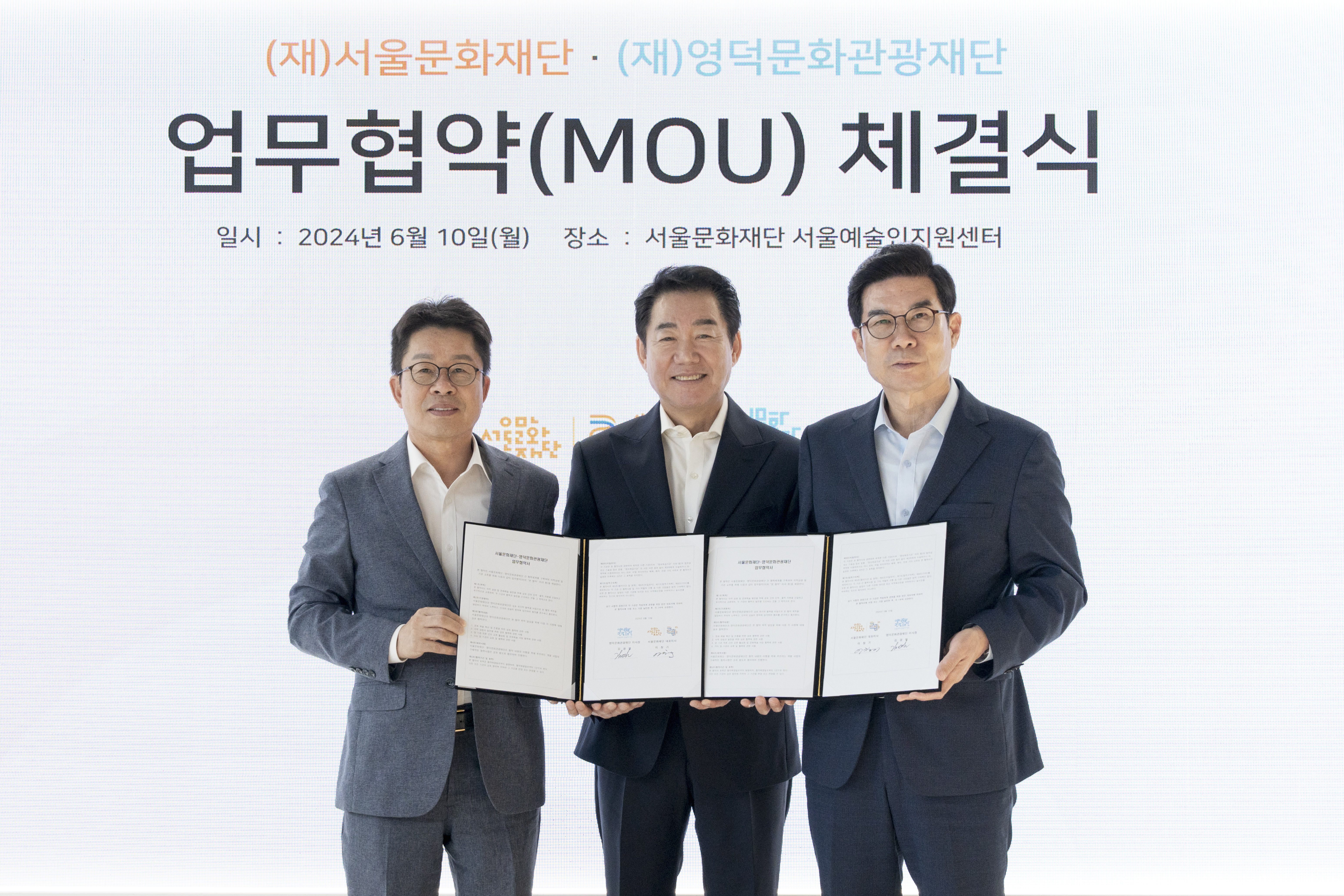 [플레이뉴스 문성식기자] 서울문화재단(대표이사 이창기)는 영덕문화관광재단(이사장 김광열)과 지난 10일(월) 동숭동 서울예술인지원센터에서 업무협약을 체결하고, 문화예술 활성화를 통한 지역 상생방안을 함께 찾는다고 밝혔다.