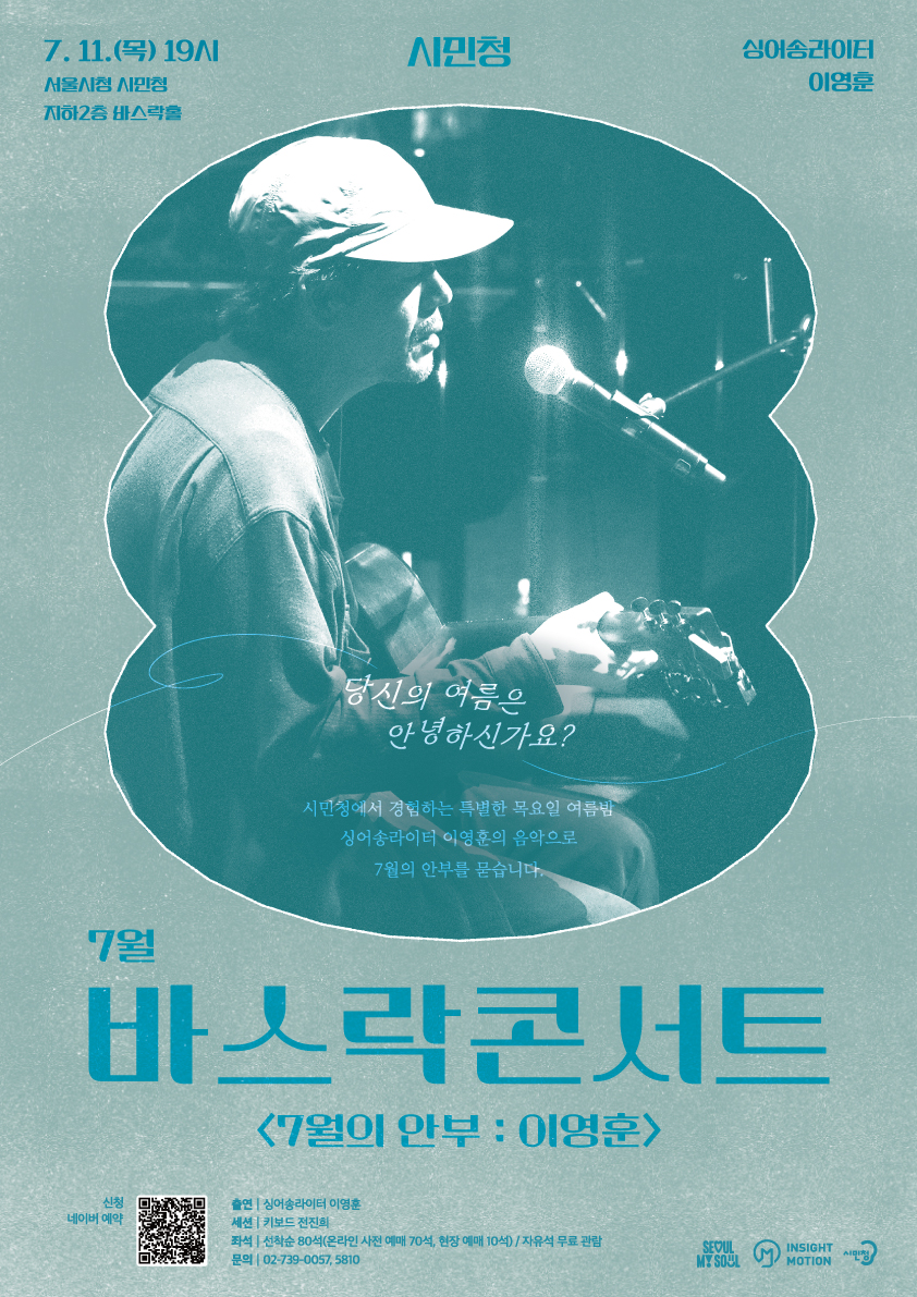7월 11일(목) 오후 7시 서울시청 시민청 지하 2층 바스락홀에서 공연 ‘7월의 안부 : 이영훈’을 진행한다. ‘7월의 안부 : 이영훈’은 서울시청 시민청의 7월 ‘바스락콘서트’ 프로그램으로, 시민 누구나 관람할 수 있는 무료 공연이다.
