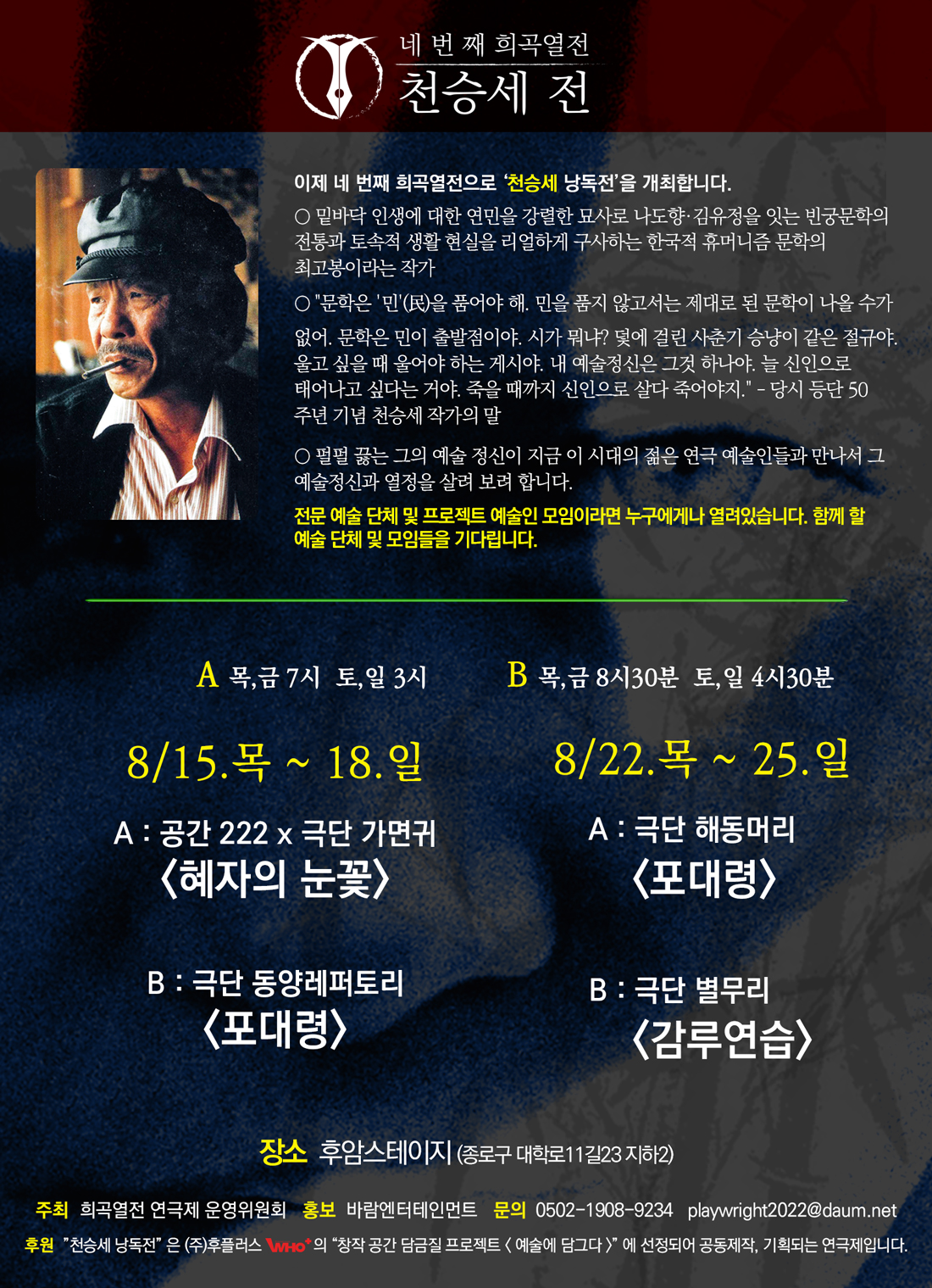 특이하게 이번 '네 번째 희곡열전 : 천승세 전' 은 2024년과 2025년에 이어 2개년으로 진행된다. 이는, 천승세 작가의 작품세계가 방대하고, 소설작품이 많아 희곡화하는 작업에 많은 노력이 필요하다.