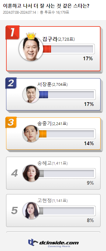 커뮤니티 포털사이트 디시인사이드(대표 김유식)가 `이혼하고 나서 더 잘 사는 것 같은 스타는?`으로 투표를 한 결과 김구라가 1위에 올랐다. 이 투표는 지난 8일부터 14일까지 총 7일간 진행했다.