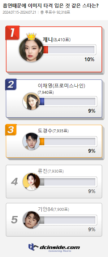 커뮤니티 포털사이트 디시인사이드(대표 김유식)가 `흡연때문에 이미지 타격 입은 것 같은 스타는?`으로 투표를 한 결과 제니가 1위에 올랐다. 이 투표는 지난 15일부터 21일까지 총 7일간 진행했다.