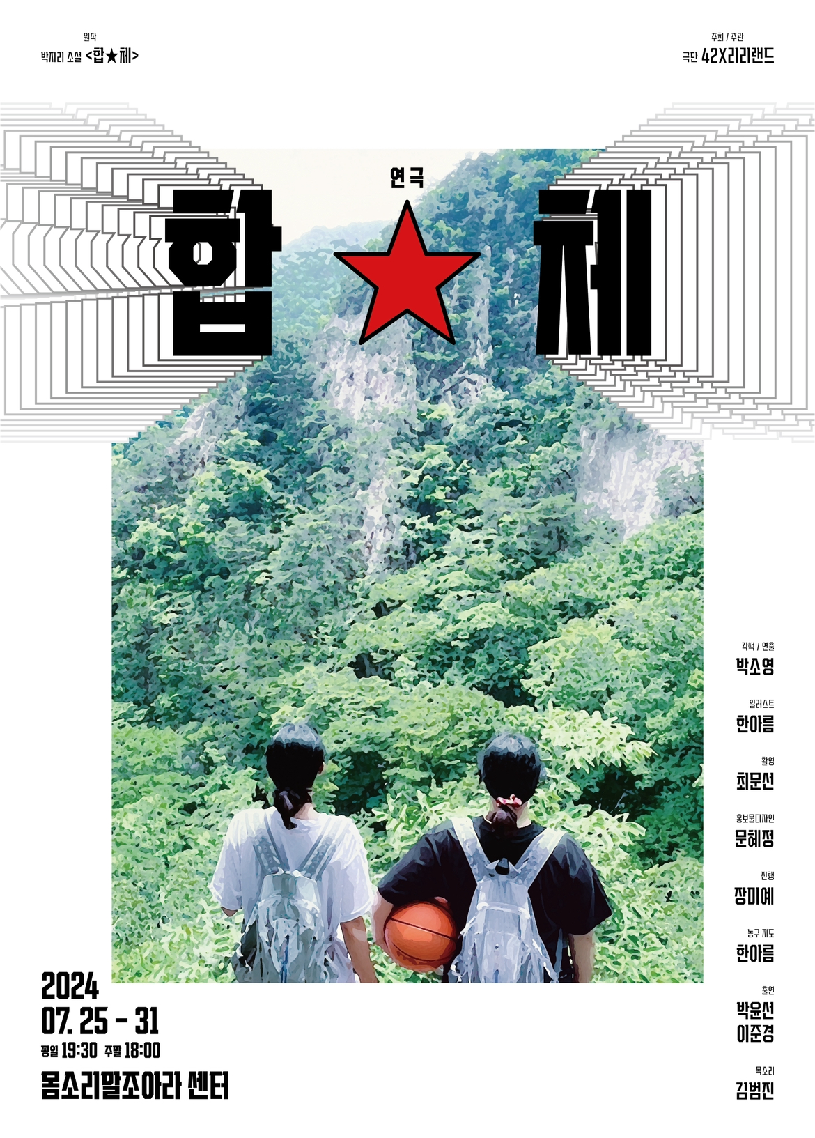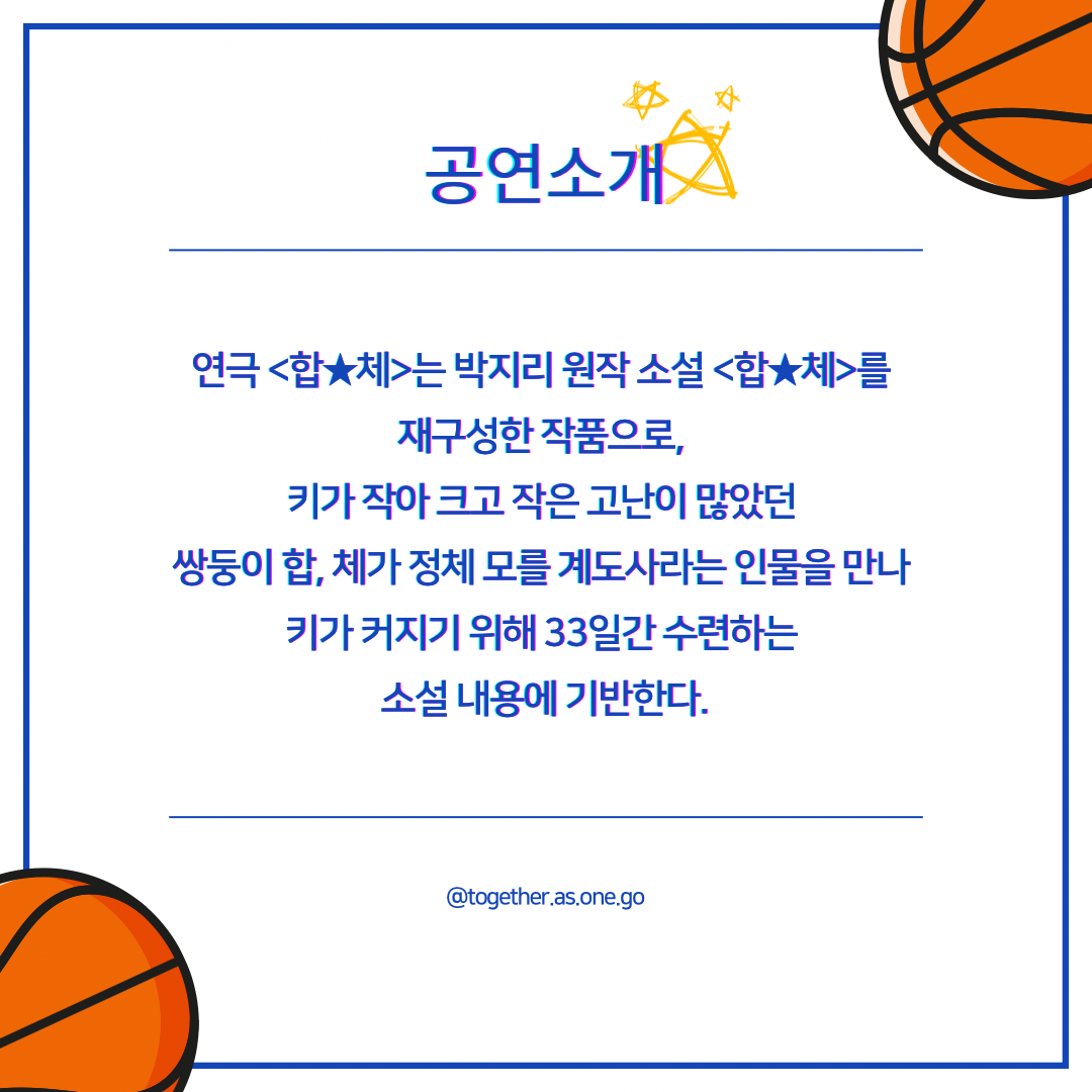 | 연극 '합★체' 시놉시스 박지리 원작소설 <합★체>를 각색 한 신개념 이동형 연극 “다시 튀어오를 수 있는 힘”을 찾아 나선 키 작은 쌍둥이 형제의 수련기! 쌍둥이 형제 ‘오합’과 ‘오체’는 키가 작은 고등학생이다. 공으로 서커스를 하다 길에서 돌아가신 아버지는 합과 체보다 더 키가 작은 난쟁이였다. 아버지의 죽음과 작은 키로 인한 여러 사건으로 받은 상처가 당장이라도 터질 것 같던 어느 날, 체는 뱀에 물린 한 노인을 구해주게 된다. 그 노인은 자신을 ‘계도사’라고 밝히며 키 크는 수련 비법을 알려준다. 키 크는 것이 평생의 염원이었던 체와 합은 계도사가 알려준 계룡산 형제 동굴로 떠나 33일간의 수련을 시작한다. |