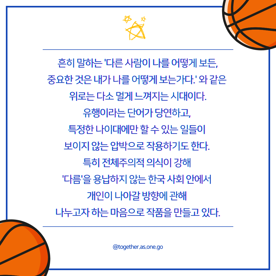 합과 체로 표현되는 우리의 청소년기는 실제보다 조금 더 자유로울 것이다. 그러므로 우리는 제약된 공간이 아닌, 푸르른 산과 회색 건물이 보이는 서울 어딘가의 야외 옥상에서 공연을 올린다. 학창시절 우리는 개인의 자유로운 도전이 다소 억눌린 채로 성장기를 보낸다. 튀는 것을 용납하지 못하고, 모두 비슷한 얼굴로, 비슷한 길을 걷는 것이 정도인 사회이다. 그러나 우리는 시스템에 비장하게 저항하고 싶지 않다. 밀도 있게 꽉 차 감옥처럼 우리를 억누르는 시스템 한가운데에서 숟가락 하나만을 가지고 바깥으로 탈출하는, 작고 장난스러운 길을 그리고 싶다.