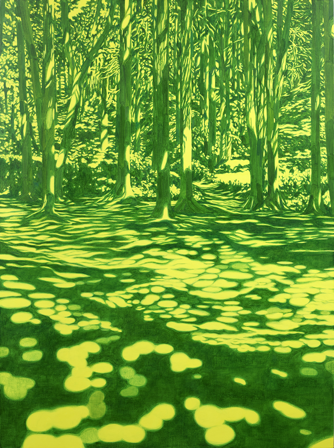 어둠과 빛을 동일한 선상에서 각각 노란색과 녹색을 사용해 표현하는 작가는 어둠을 빛의 이면이 아니라 동일한 선상에서 그린 그림으로 우리 삶을 빗대어 표현한다.