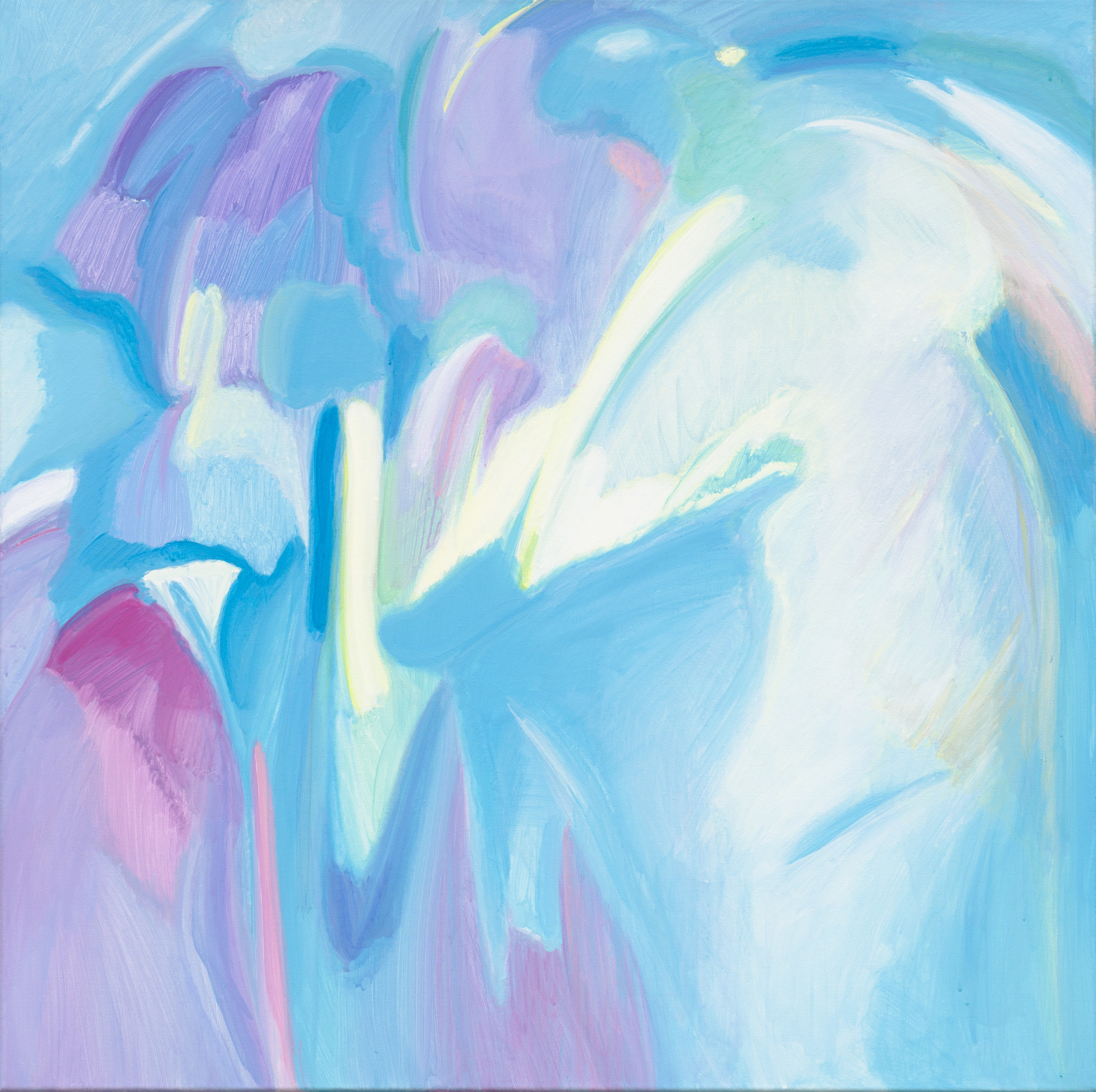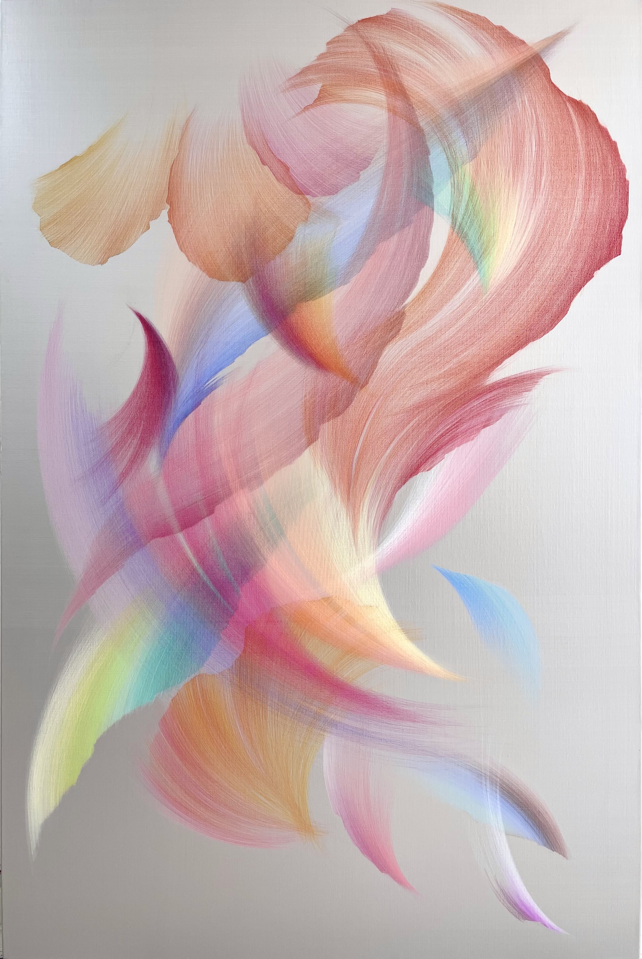 광학과 기상학에 관심이 많은 오희원 작가는 빛의 산란과 공기 흐름 등 비가시적 현상을 은분(銀粉) 바른 캔버스 위에 가시적으로 표현한다.