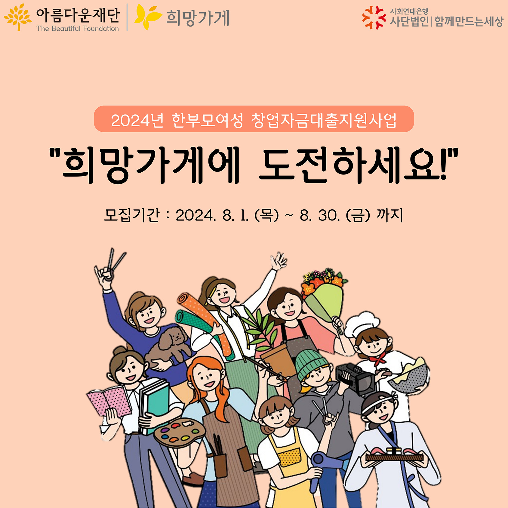 [플레이뉴스 문성식기자] 함께만드는세상(사회연대은행)이 아름다운재단 한부모여성 창업자금 대출 지원사업 ‘희망가게’ 참여자 모집을 시작한다.