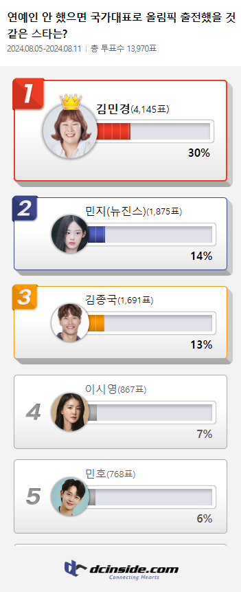 커뮤니티 포털사이트 디시인사이드(대표 김유식)가 `연예인 안 했으면 국가대표로 올림픽 출전했을 것 같은 스타는?`으로 투표를 한 결과 김민경이 1위에 올랐다. 이 투표는 지난 5일부터 11일까지 총 7일간 진행했다.