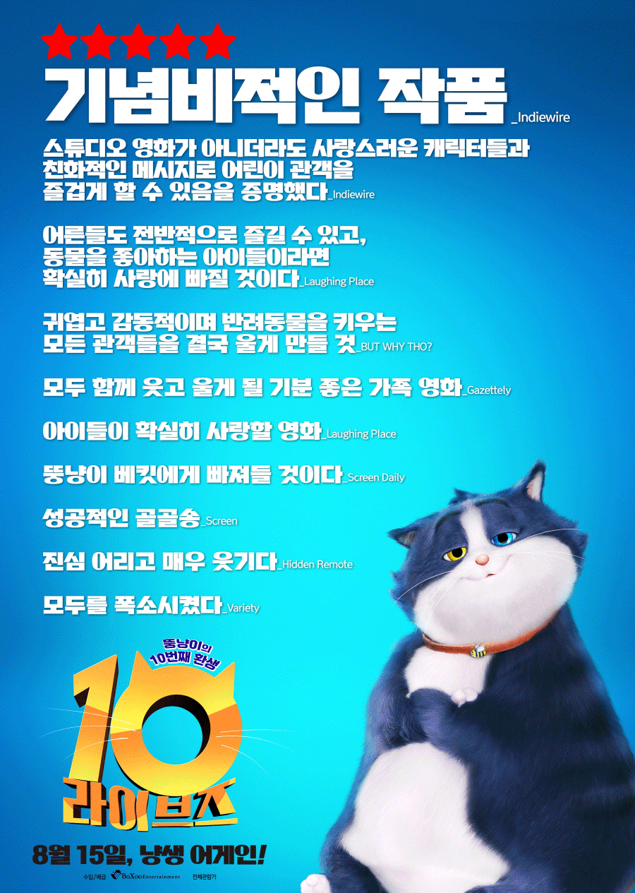 또한 국내 리뷰 포스터는 “가족들이 보기 좋은 영화로 강추강추!’(인스타그램 hanna**), “웃음이 끊이지 않았다”(네이버 블로그, CL****), “새끼고양이 넘 귀엽고 뚱냥이는 더 귀여워요” (CGV, PP***soo), “난 웃으며 봤던 장면을 아이는 슬프게 받아드렸다는 것에 새삼 뭔가를 또 배운 느낌”(인스타그램 lim**),