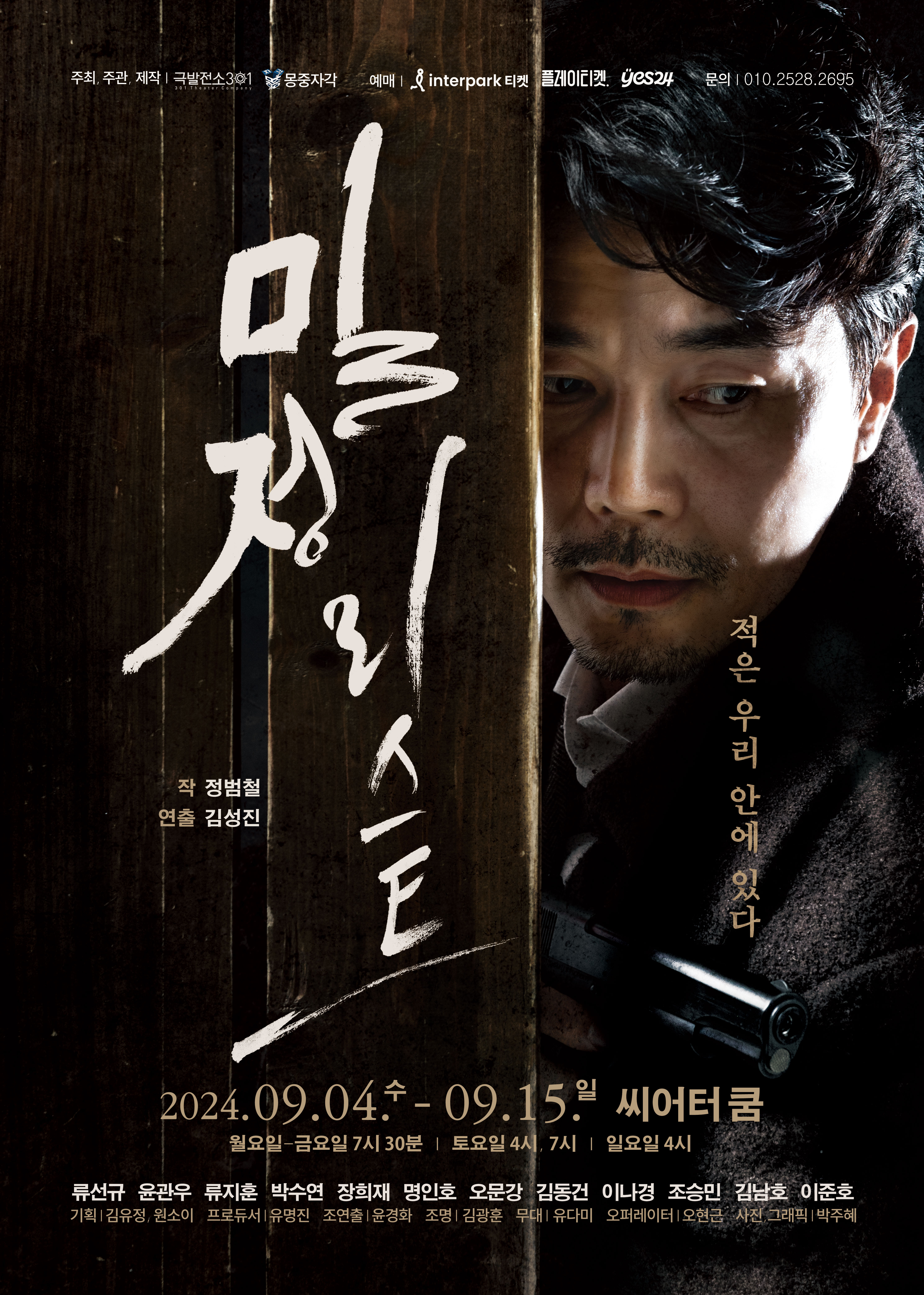 모든 세대가 공감할 수 있는 연극 '밀정리스트'는 류선규, 윤관우, 류지훈, 박수연, 장희재, 명인호, 오문강, 김동건, 이나경, 조승민, 김남호, 이준호 배우가 출연하여 무대를 빛낼 예정이다.