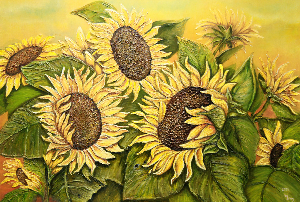 작품명 "올 가을"은 활짝 핀 해바라기 풍경을 정감 있는 표현으로 힐링의 시간을 전달하고 있는데, 해만 바라보는 꽃의 형상이 아닌 여러 개의 꽃 봉우리가 서로를 바라보며 사랑을 하고 행복의 미소를 짓는 다정한 모습으로 그렸다.