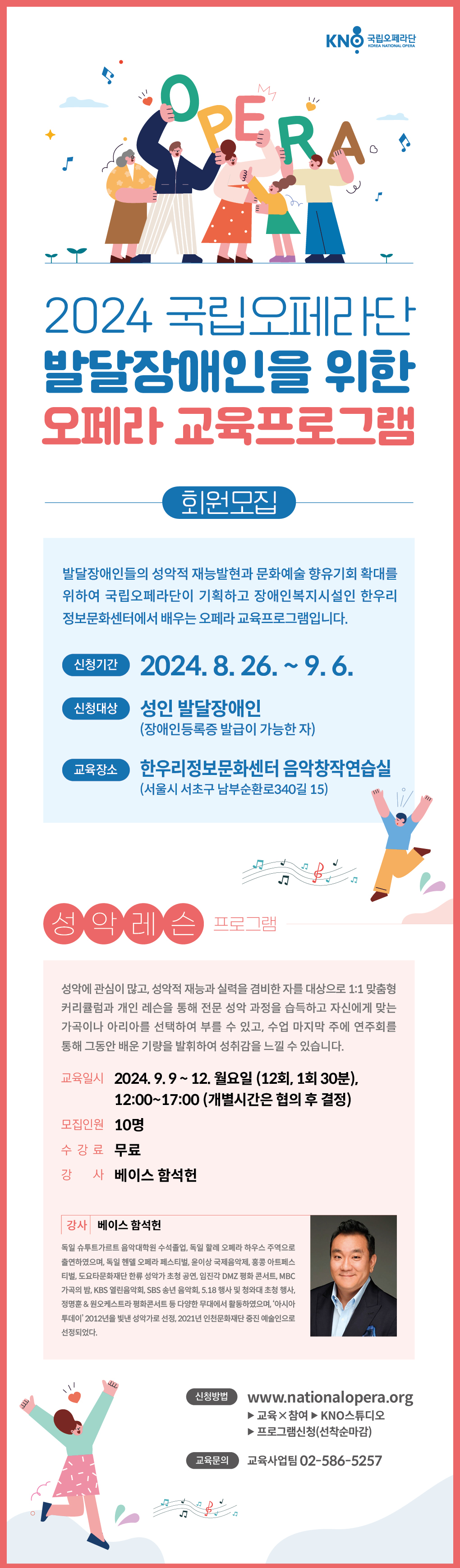 오는 9월 6일(금)까지 신청가능하며 장애인등록증 발급이 가능한 성인 발달장애인이라면 누구나 신청할 수 있다. 교육기간은 9월부터 12월까지로 참가자들은 총 4개월 동안 무료로 진행되는 이번 교육 프로그램을 통해 오페라와의 즐거운 만남을 이어나간다.