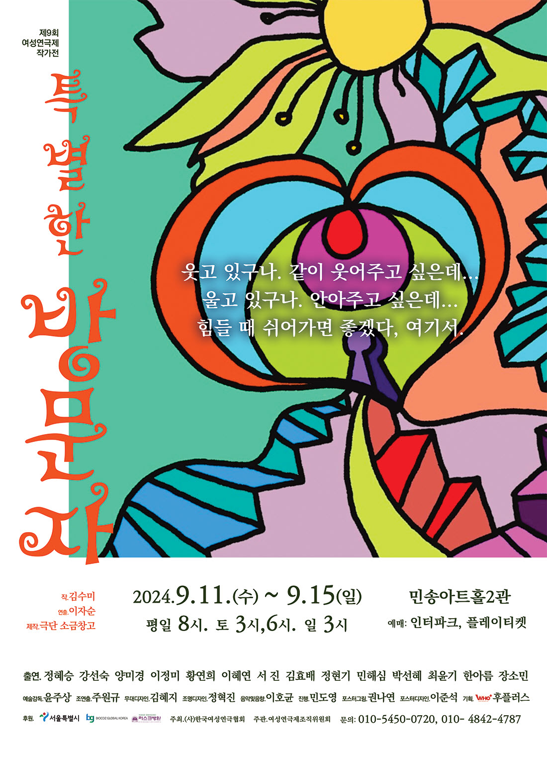 2024년 9월 11일(수)부터 15일(일)까지, 민송아트홀2관에서 공연되는 연극 '특별한 방문자'는 김수미 작, 이자순 연출의 창작 초연 공연으로, 윤주상 예술감독, 정혜승, 강선숙, 양미경, 이정미, 황연희, 이혜연, 서진, 정현기, 김효배, 박선혜, 민해심, 최윤기, 한아름, 정소민 배우가 출연한다.
