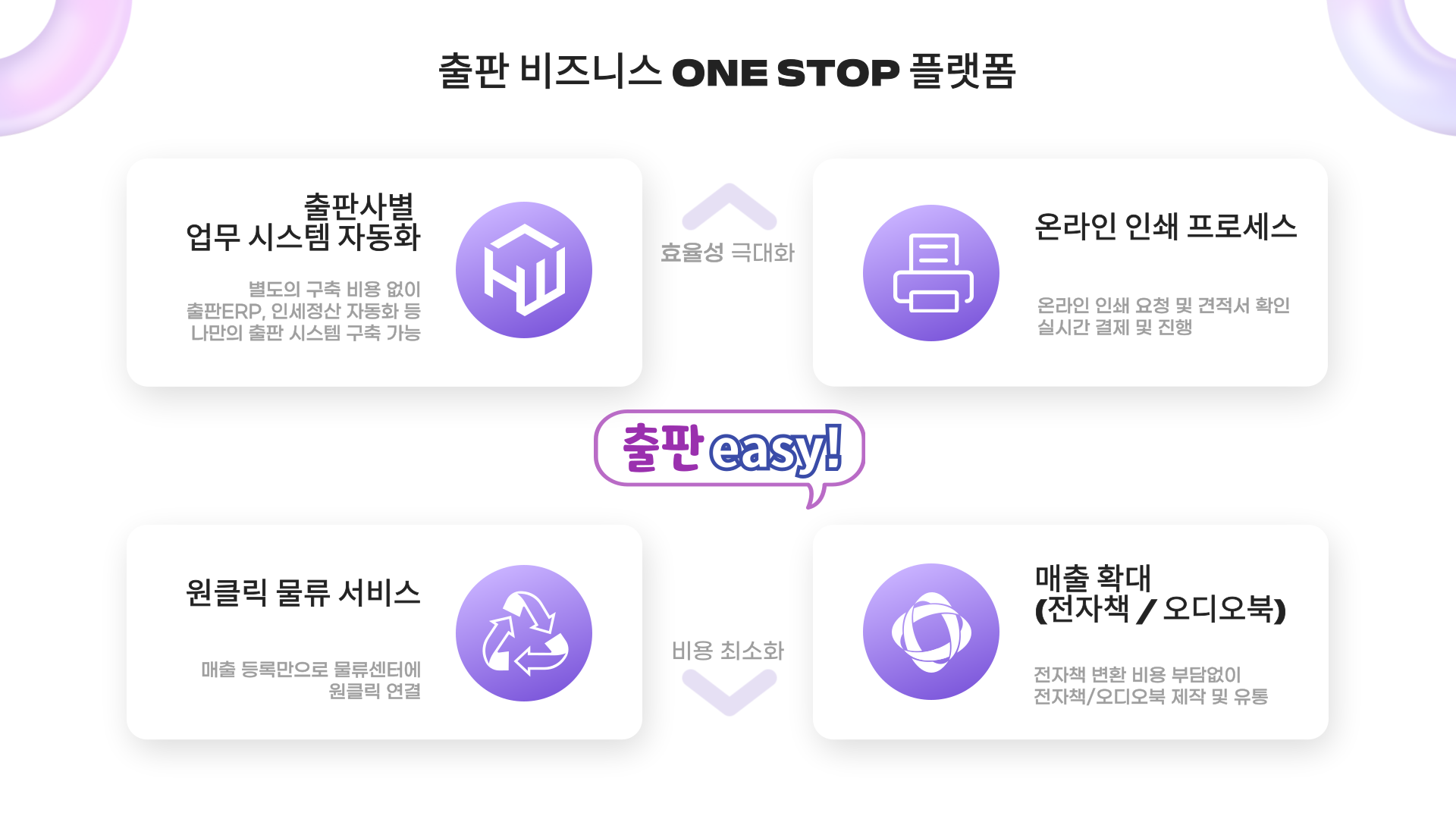 출판easy에는 출판 전문 ERP 기능, 인세 정산 자동화, 옵셋/POD 등 인쇄 온라인화, 스마트 물류 서비스, 전자책/오디오북 제작 및 유통까지 출판에 필요한 모든 기능이 담겨 있다.