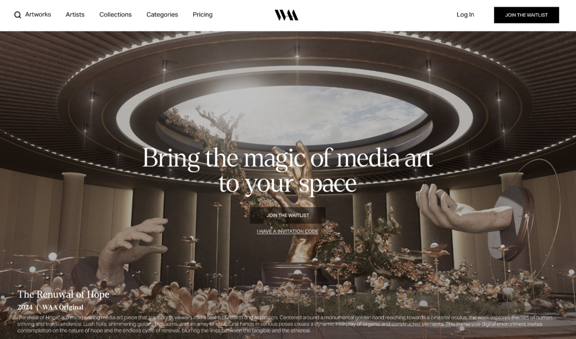 WAA는 고객이 디지털 사이니지와 공간 기반 미디어아트 작품을 활용함으로써 평범한 공간을 혁신적인 아트 공간으로 마법처럼 탈바꿈할 수 있도록 돕는다.