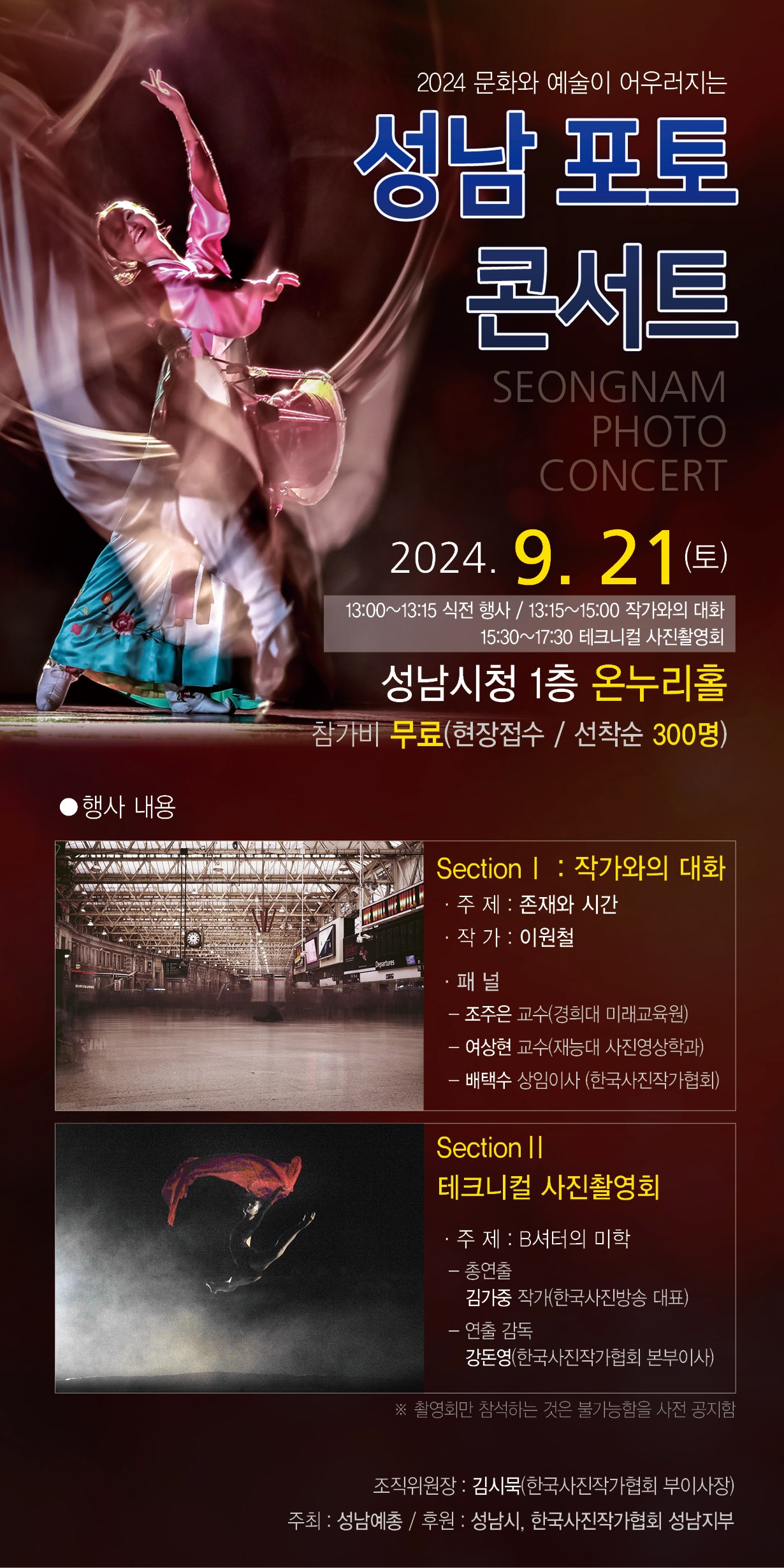 한국예총 성남시지회(회장 송위혁)가 주최하고 한국사진방송이 주관하는 성남포토콘서트(조직위원장 김시묵)가 오는 9월 21일(토) 개최된다.