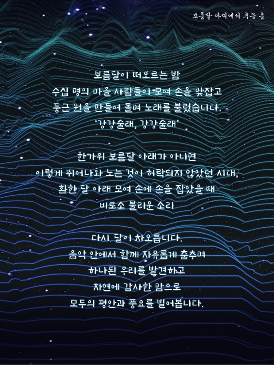 '보름달 아래에서 추는 춤'은 마음껏 자유를 누리며 자연 신을 생각하고 주변 사람들과 하나됨을 느끼는 시간과 감각을 잃어버린듯한 이 시대에, 보름달 아래에서 즐겼던 ‘강강술래’가 그 시절 여인들에게 주었던 것처럼 ‘자유와 평등, 그리고 자연에 대한 인정과 감사’를 다시금 느낄 수 있게 할 것이다.