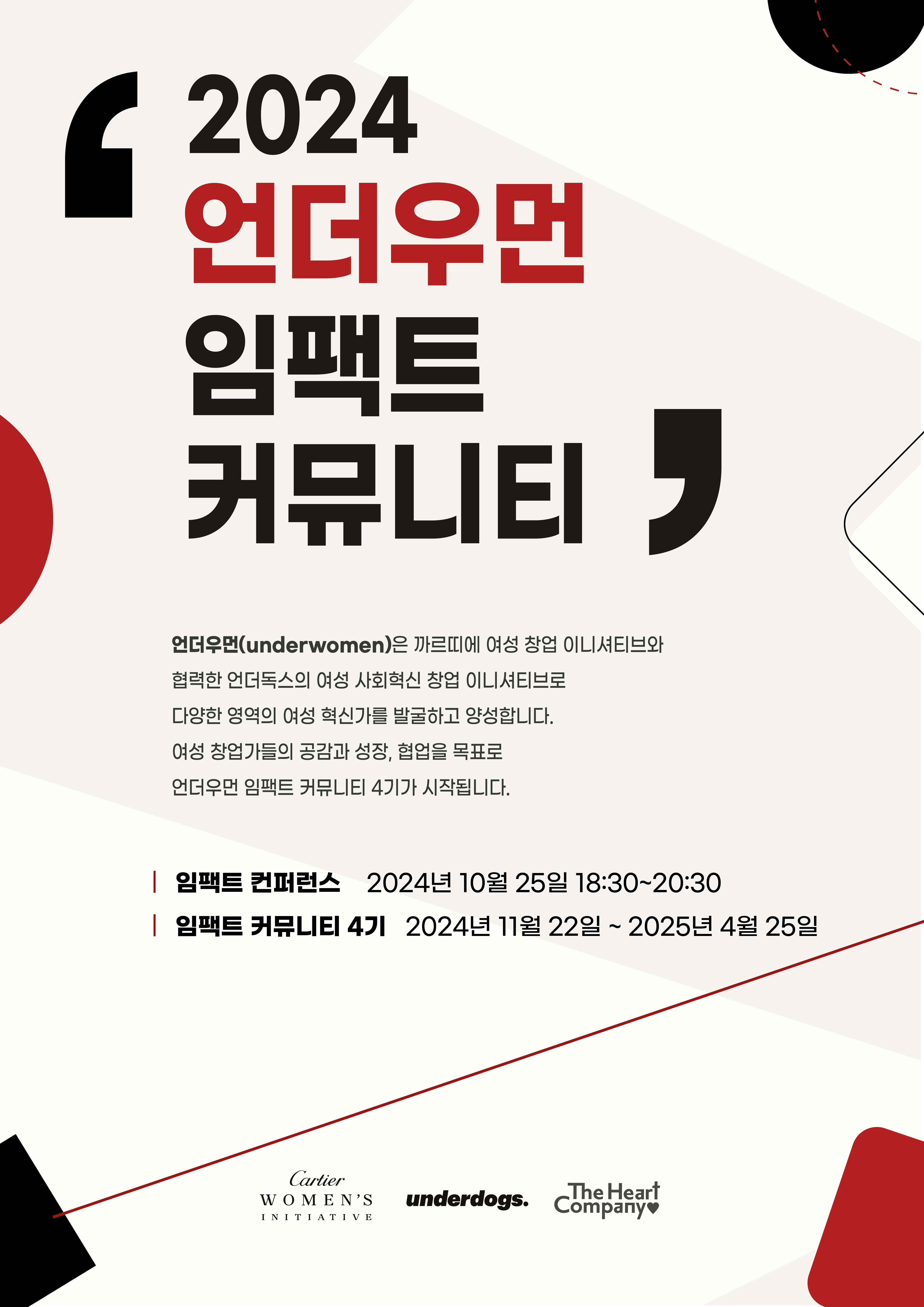 [플레이뉴스 문성식기자] ‘까르띠에 여성 창업 이니셔티브(Cartier Women’s Initiative)’와 협력을 통해 국내외 혁신 창업가를 발굴하고 육성하며 창업 전반을 지원하는 창업 교육 기업인 언더독스가 2021년도 시작한 사업에 이어 ‘언더우먼 임팩트 커뮤니티 4기’를 10월 16일부터 11월 6일까지 모집한다.