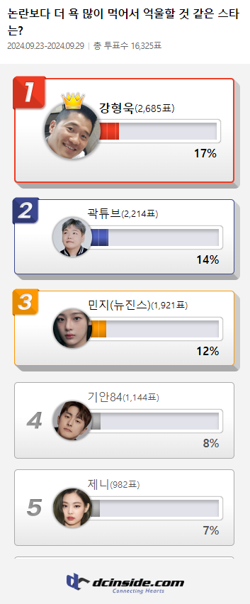 커뮤니티 포털사이트 디시인사이드(대표 김유식)가 `논란보다 더 욕 많이 먹어서 억울할 것 같은 스타는?`으로 투표를 한 결과 강형욱이 1위에 올랐다.