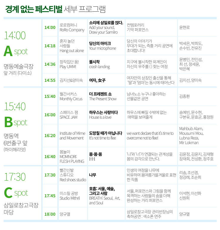 ‘경계 없는 페스티벌’은 10월 12일(토) 오전 11시 30분 삼일로창고극장 마당에서의 개막식으로 출발한다. 참가자 모두가 참여하여 테이프를 커팅하는 오프닝 퍼포먼스 이후 본 공연은 오후 2시부터 명동예술극장 앞, 명동역 6번 출구, 삼일로창고극장 등 세 개의 스폿에서 차례로 이뤄진다.