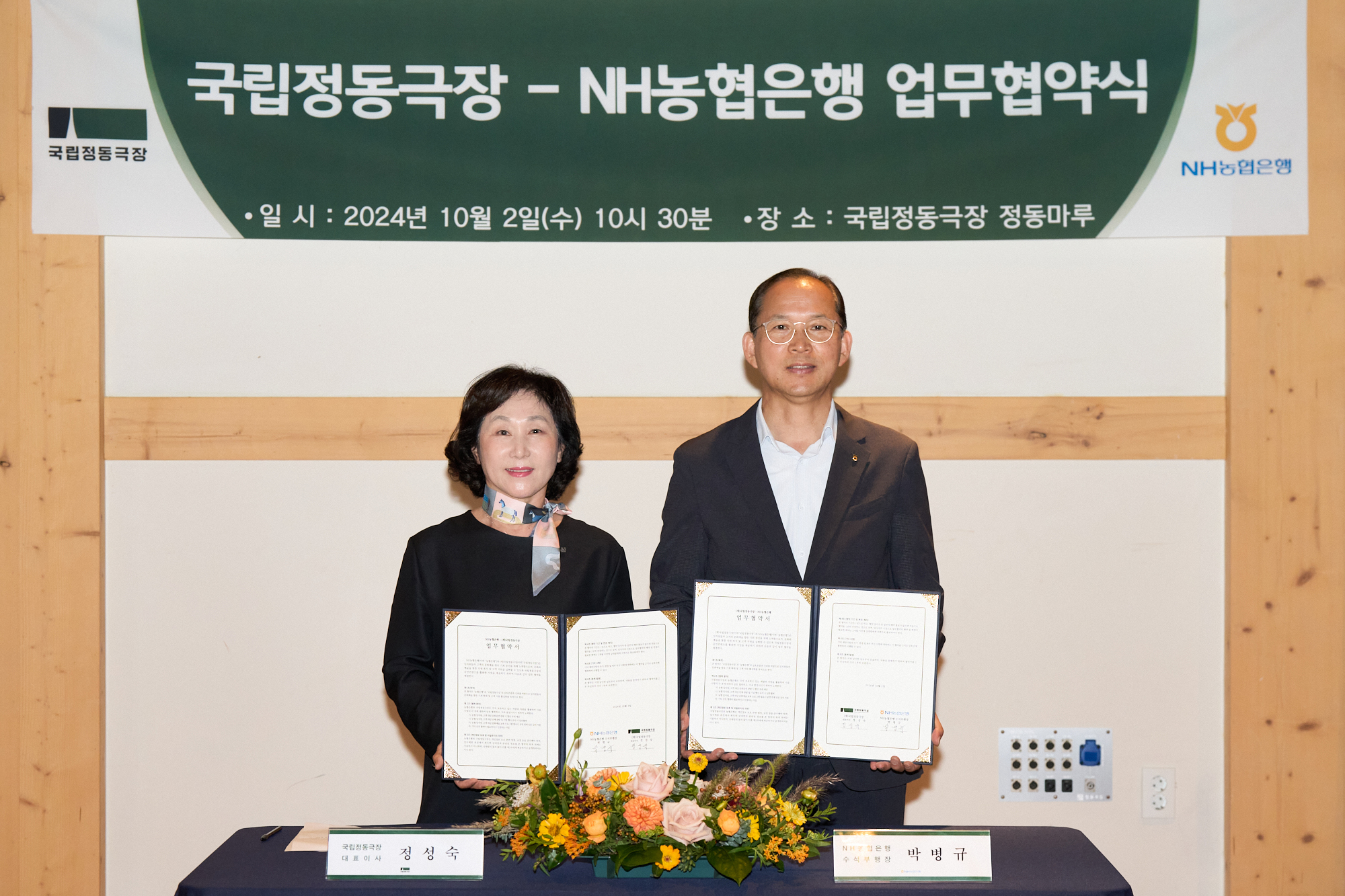 10월 2일(수) 국립정동극장 정동마루에 진행된 업무협약식에는 국립정동극장 정성숙 대표이사와 NH농협은행 박병규 수석부행장 등 양사 주요 관계자가 참석해 상호협력을 추진하기로 했다.