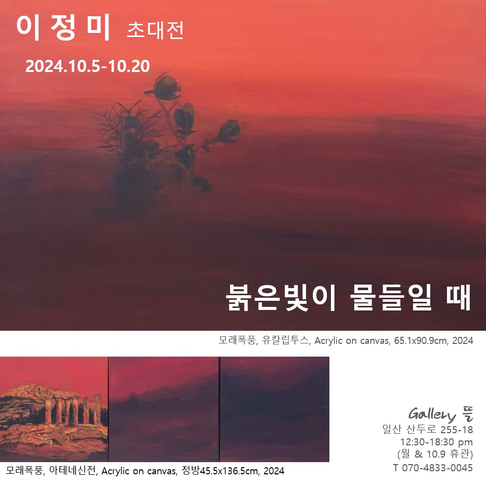 [플레이뉴스 문성식기자] 기후위기로 고통 받고 있는 지구의 환경적, 생태적 상황을 강열한 붉은톤으로 전체 흐름을 지배하여 심각성을 경고하고 사회적 이슈로 전환해 자연의 중요성을 강조하는 작품으로 창작을 하는 이정미 작가는 2024년 10월 5일(토) ~ 10월 20일(일)까지 고양시 일산 소재의 갤러리뜰(대표 김유선)에서 "붉은 빛이 물들일 때" 타이틀로 초대 개인전을 진행 중에 있다.