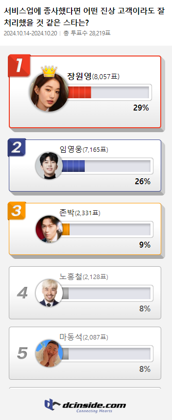 커뮤니티 포털사이트 디시인사이드(대표 김유식)가 `서비스업에 종사했다면 어떤 진상 고객이라도 잘 처리했을 것 같은 스타는?`으로 투표를 한 결과 장원영이 1위에 올랐다. 이 투표는 지난 14일부터 20일까지 총 7일간 진행했다.