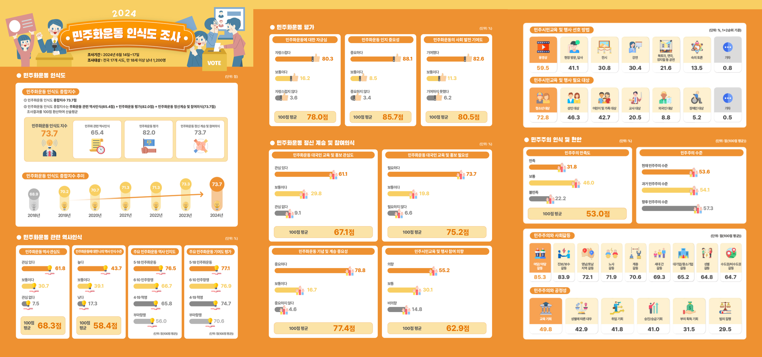 반면 민주화운동 인식도 종합지수는 73.7점을 기록했다. 주요 지수인 민주화운동 관련 역사인식(78.0점), 민주화운동 평가(85.7점), 민주화운동 정신계승 및 참여의식(80.5점)을 평균한 값이다.