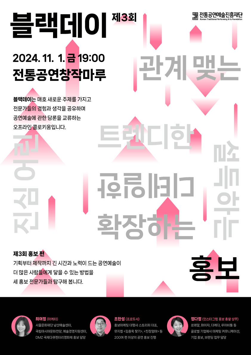 [플레이뉴스 문성식기자] 전통공연예술진흥재단(이사장 김삼진)은 공연예술 트렌드와 담론을 교류하는 콜로키움 제3회 ‘공진단 블랙데이 홍보 편’을 11월 1일 전통공연창작마루에서 개최한다.