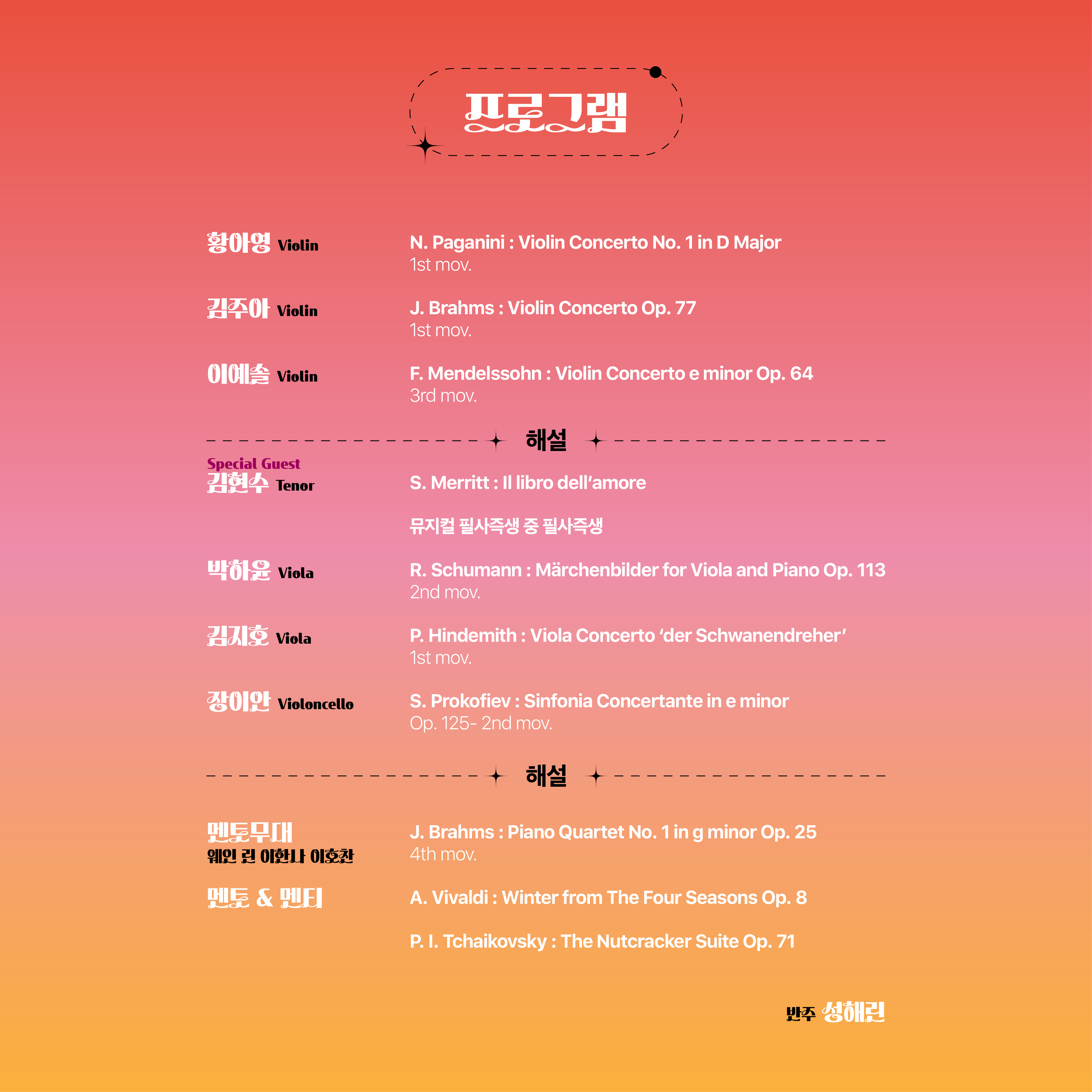 바이올린 황아영·김주아·이예솔, 비올라 박하윤·김지호, 첼로 장이안 등 차세대 음악가들이 파가니니, 브람스, 멘델스존, 슈만, 프로코피예프의 명곡을 연주하며 무대를 꾸민다. 모든 연주는 세계적인 피아니스트 성해린의 반주로 더욱 풍성하고 완성된 무대를 선보일 예정이다.