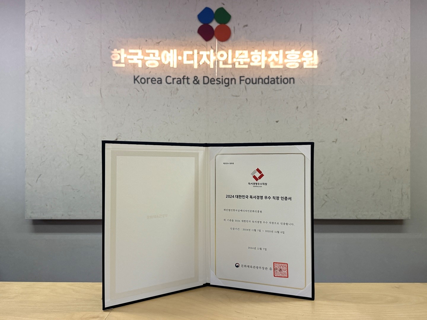[플레이뉴스 문성식기자] 한국공예·디자인문화진흥원(원장 장동광, 이하 공진원)이 직장 내 독서문화 활성화 및 지역사회 독서문화 증진에 기여한 공로로 “독서경영 우수직장”으로 선정됐다.