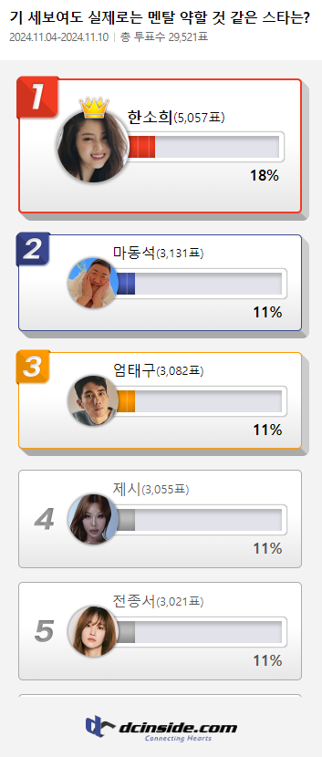 커뮤니티 포털사이트 디시인사이드(대표 김유식)가 `기 세보여도 실제로는 멘탈 약할 것 같은 스타는?`으로 투표를 한 결과 한소희가 1위에 올랐다. 이 투표는 지난 4일부터 10일까지 총 7일간 진행했다.