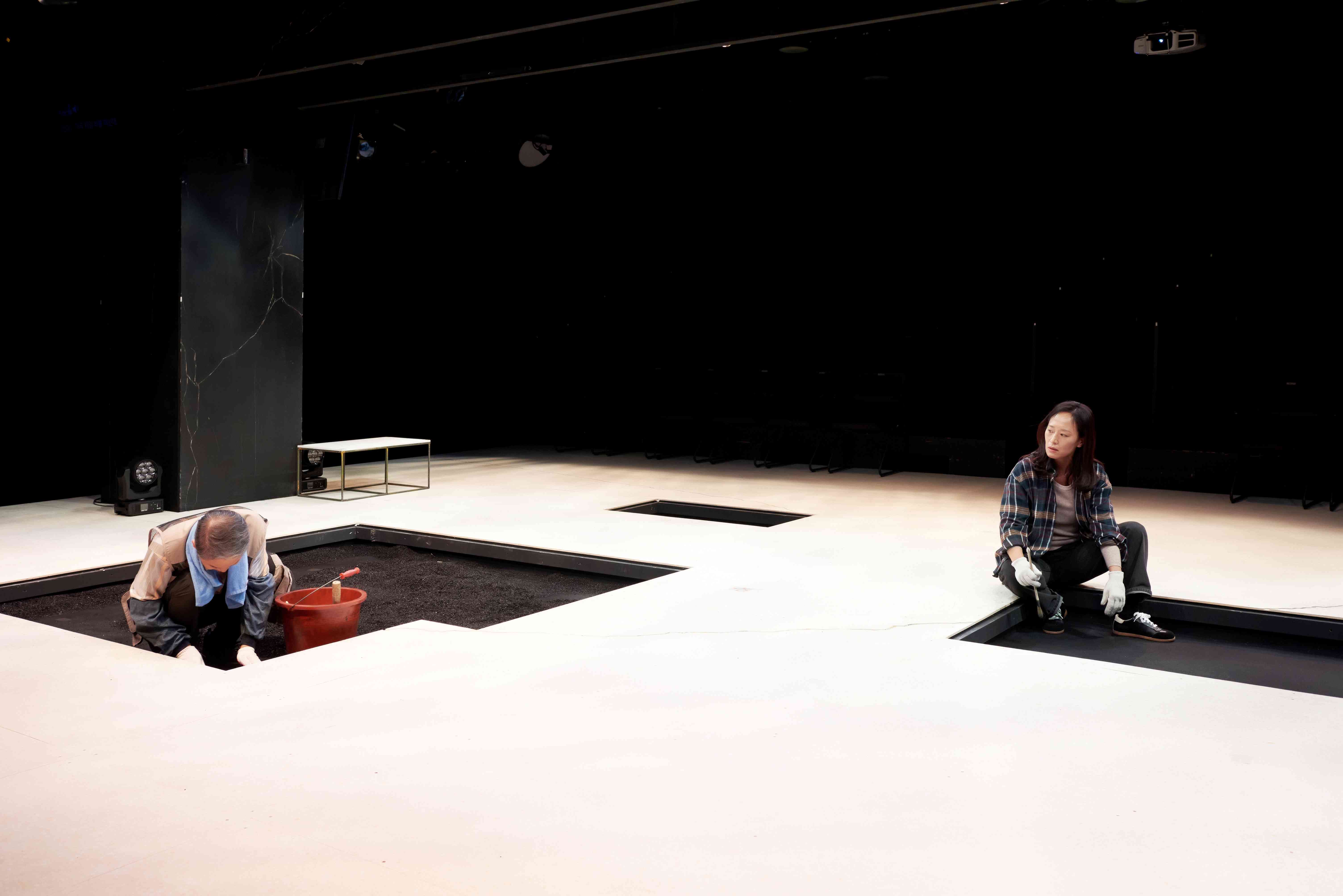 연극 '시차'는 다양한 시각 요소와 밀도 있는 대사로 관객이 무게와 고통을 간접적으로 감각하게 한다.