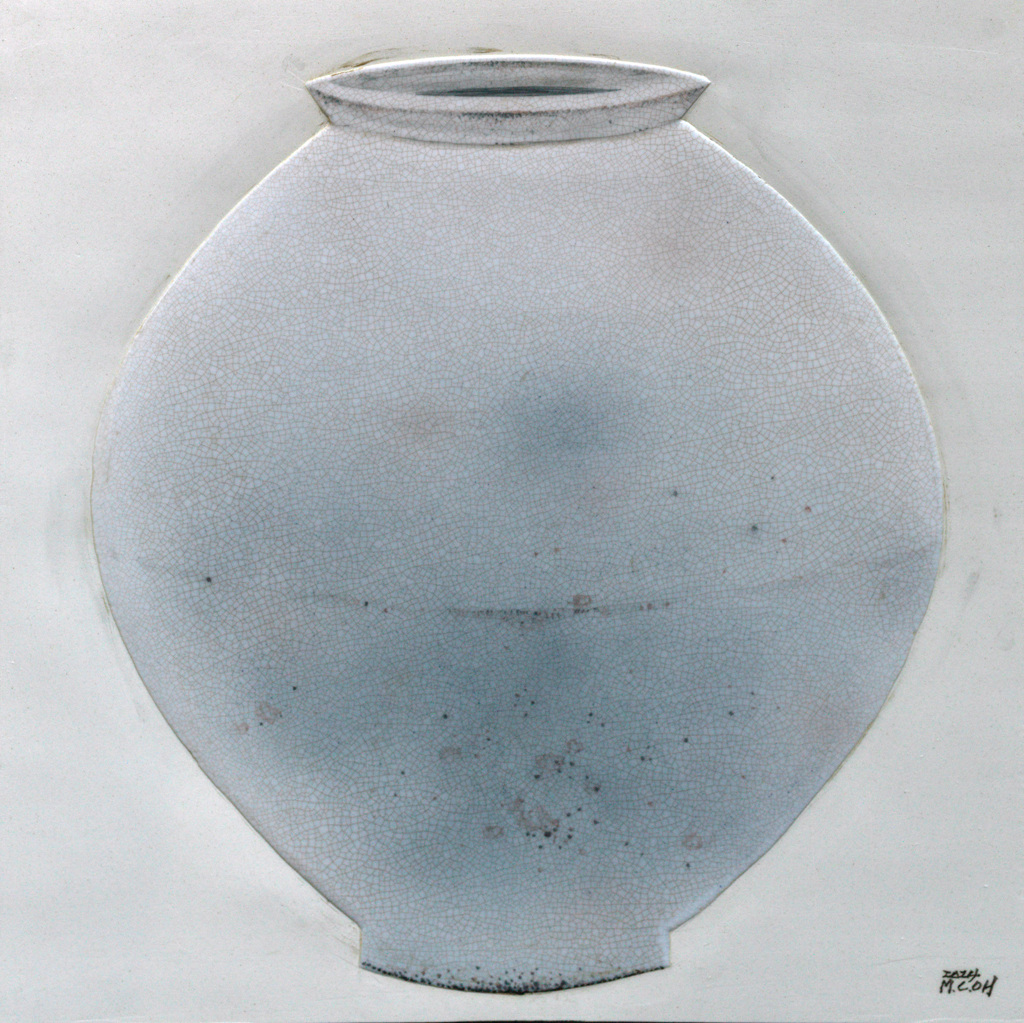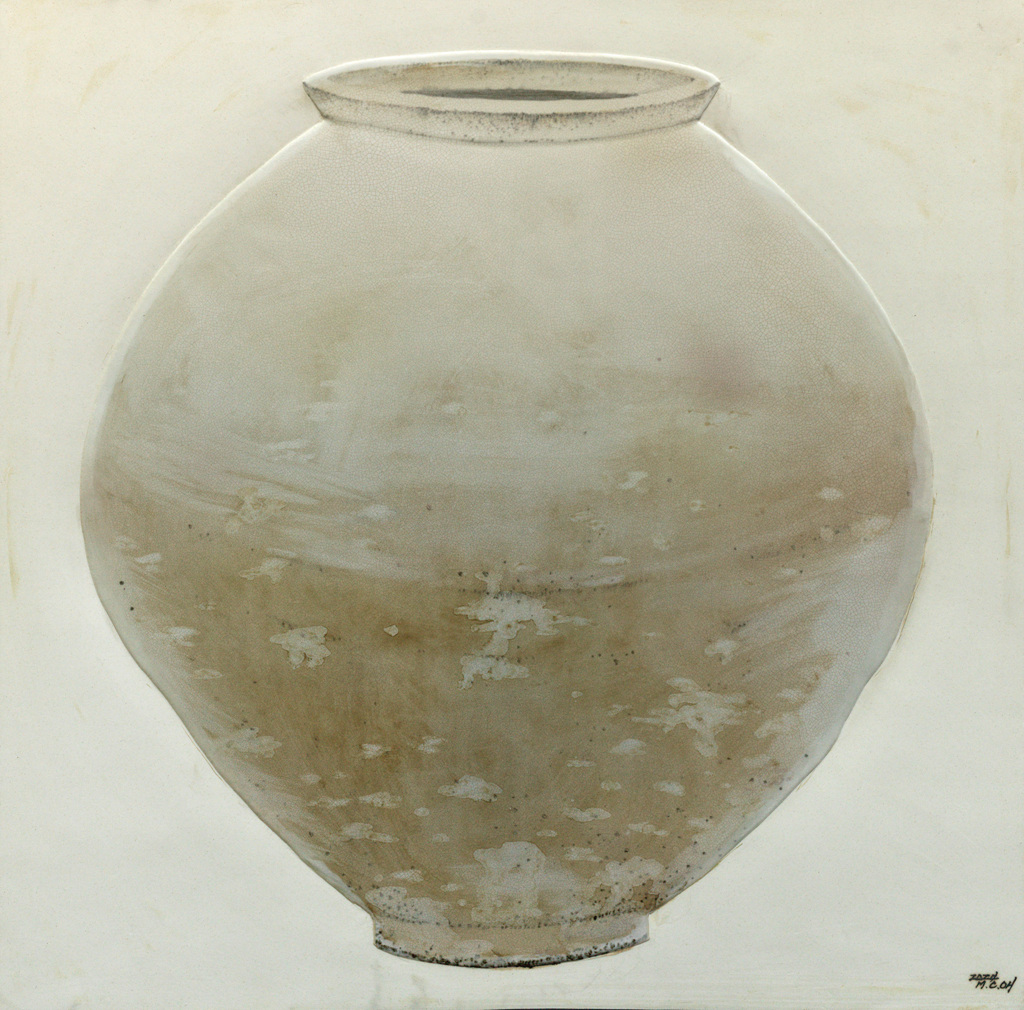3D의 달항아리를 2D의 화면 속에 넣어 평면 도자 달항아리로 재현한 작가의 작업은 가마 속에서 5일 동안 구워지면서 캔버스와 물감, 한지와 먹으로는 흉내 낼 수 없고 불과 흙의 조화 속에서 자화되어 나오는 색감과 촉감은 도자회화만이 가질 수 있는 특징이기도 하다.
