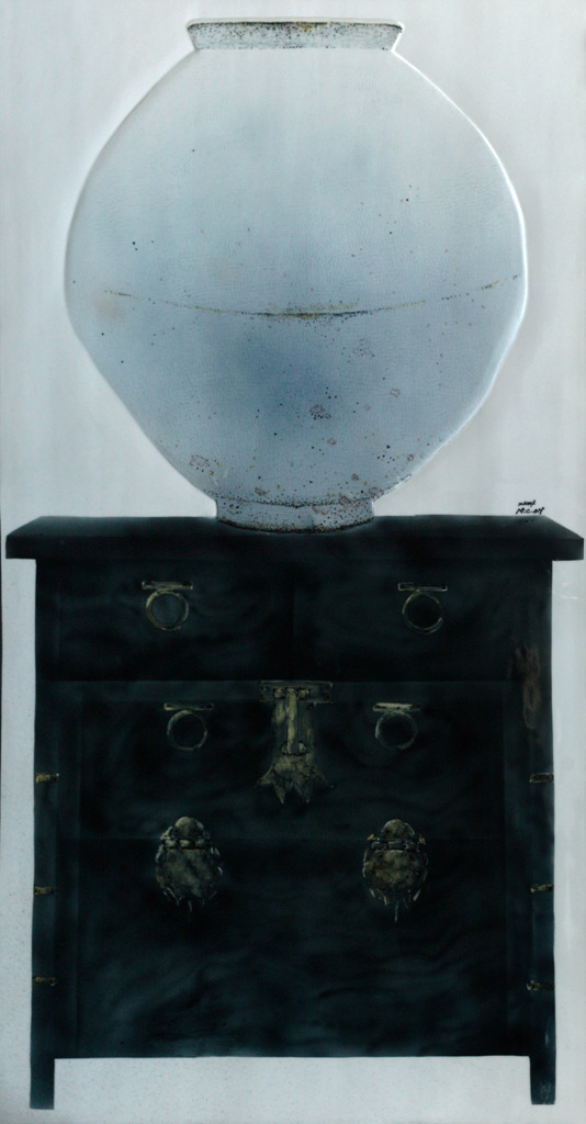 주로 백자도판에 음각으로 새겨 넣는 달항아리는 상감을 통해 디테일을 더하고 세월의 유수함 속에 자연적으로 발생되는 빙열을 묘사하기 위해 옻칠이라는 특수기법을 통해서 고도자의 느낌과 함께 자연스러운 빙열이 재생되게 하여 달항아리의 특징을 구현해서 작가의 작품세계를 더욱더 확장해가고 있다.