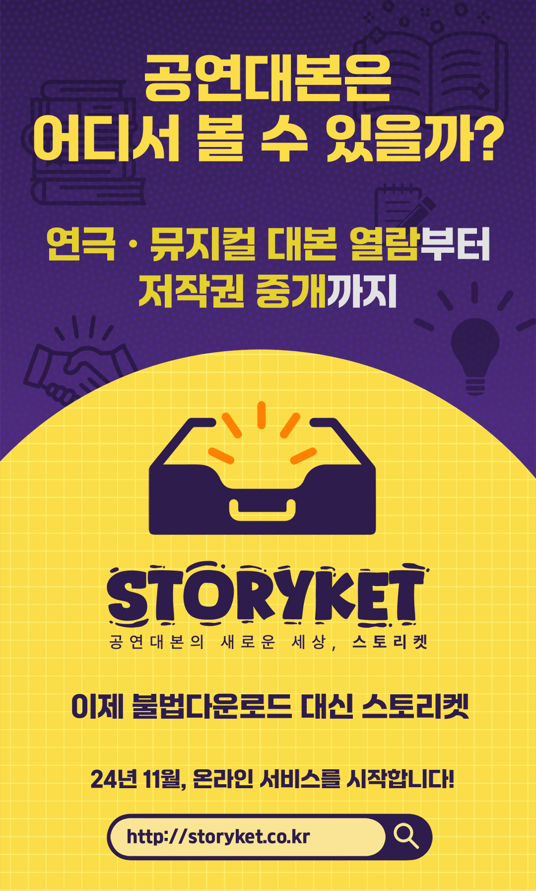지난 2021년부터 공연대본의 저작권 대리 중개서비스 진행해 온 ‘스토리켓’이 오는 11월 20일(수) 온라인서비스를 출시한다고 밝혔다. ‘스토리켓’은 소비자들에게 공연 대본 열람부터 저작권 중개 서비스를 함께 제공한다.