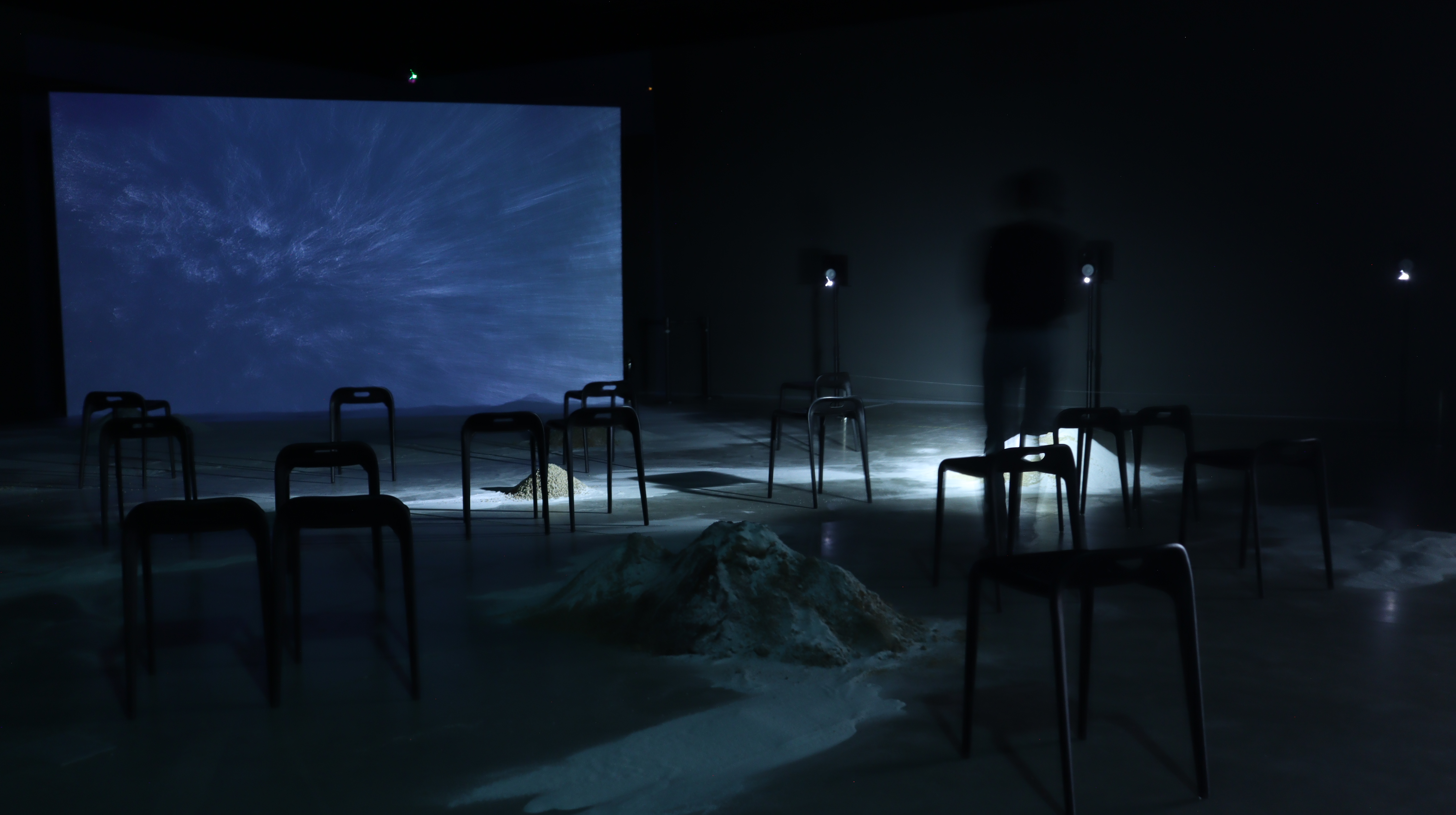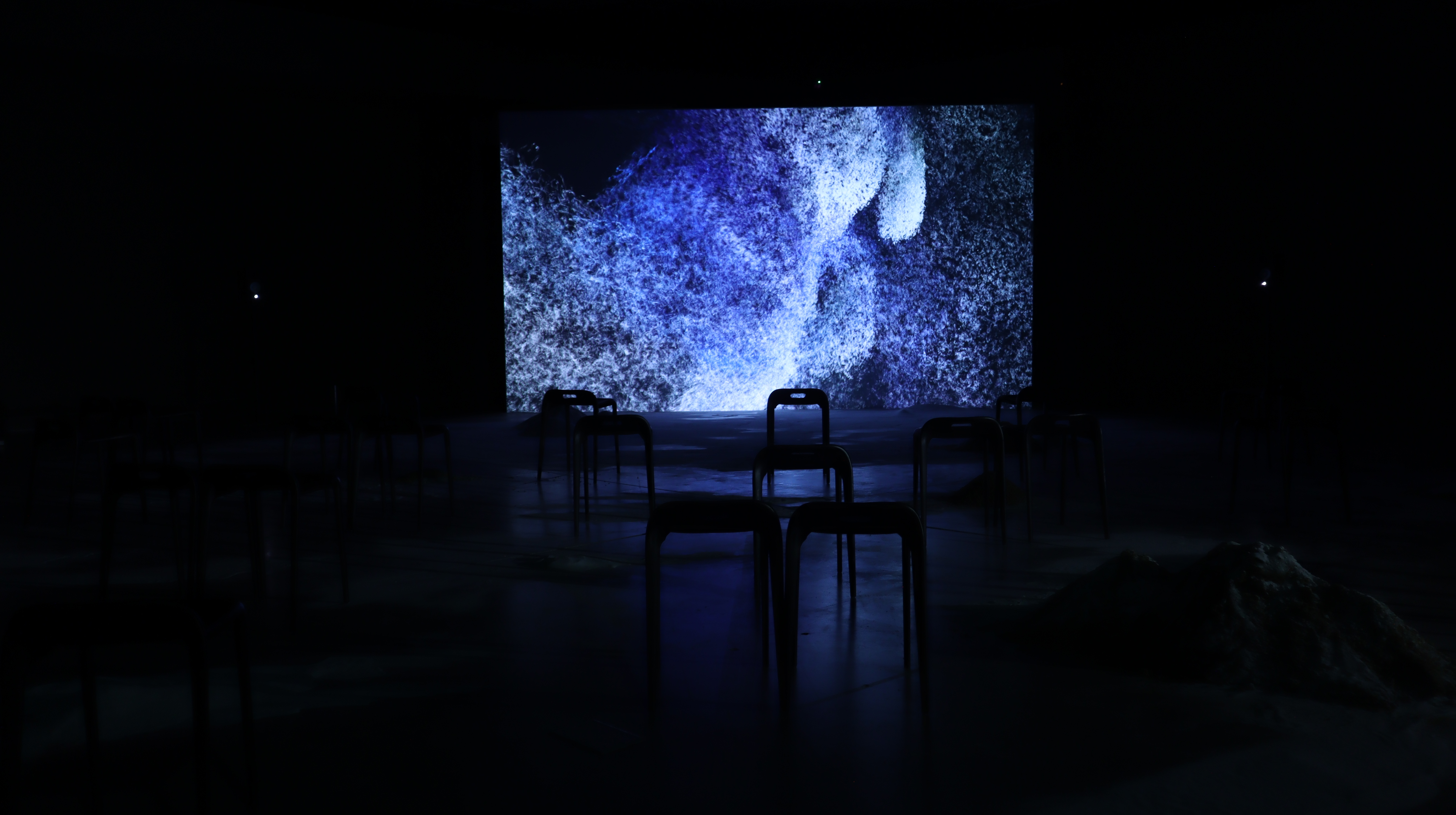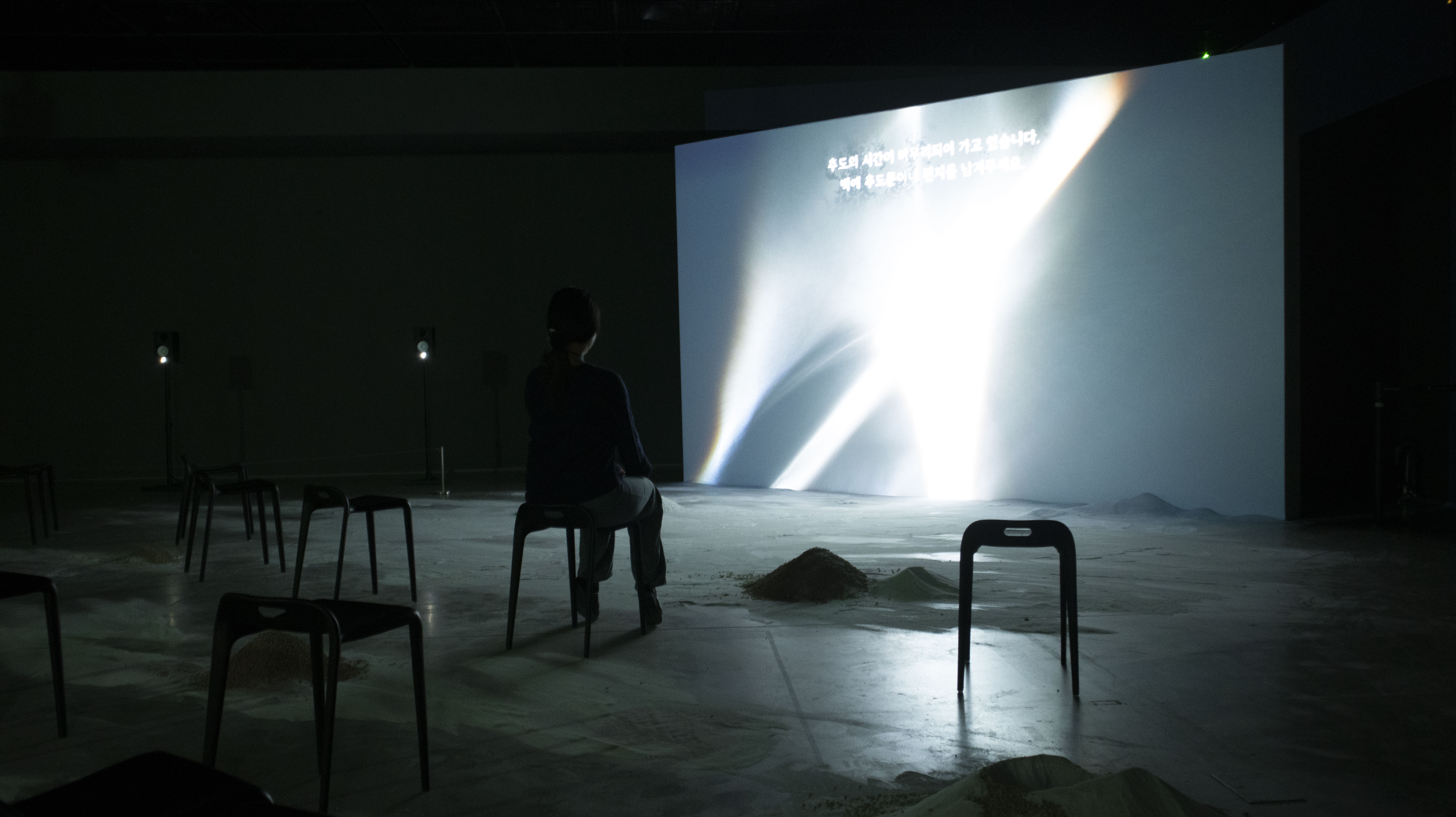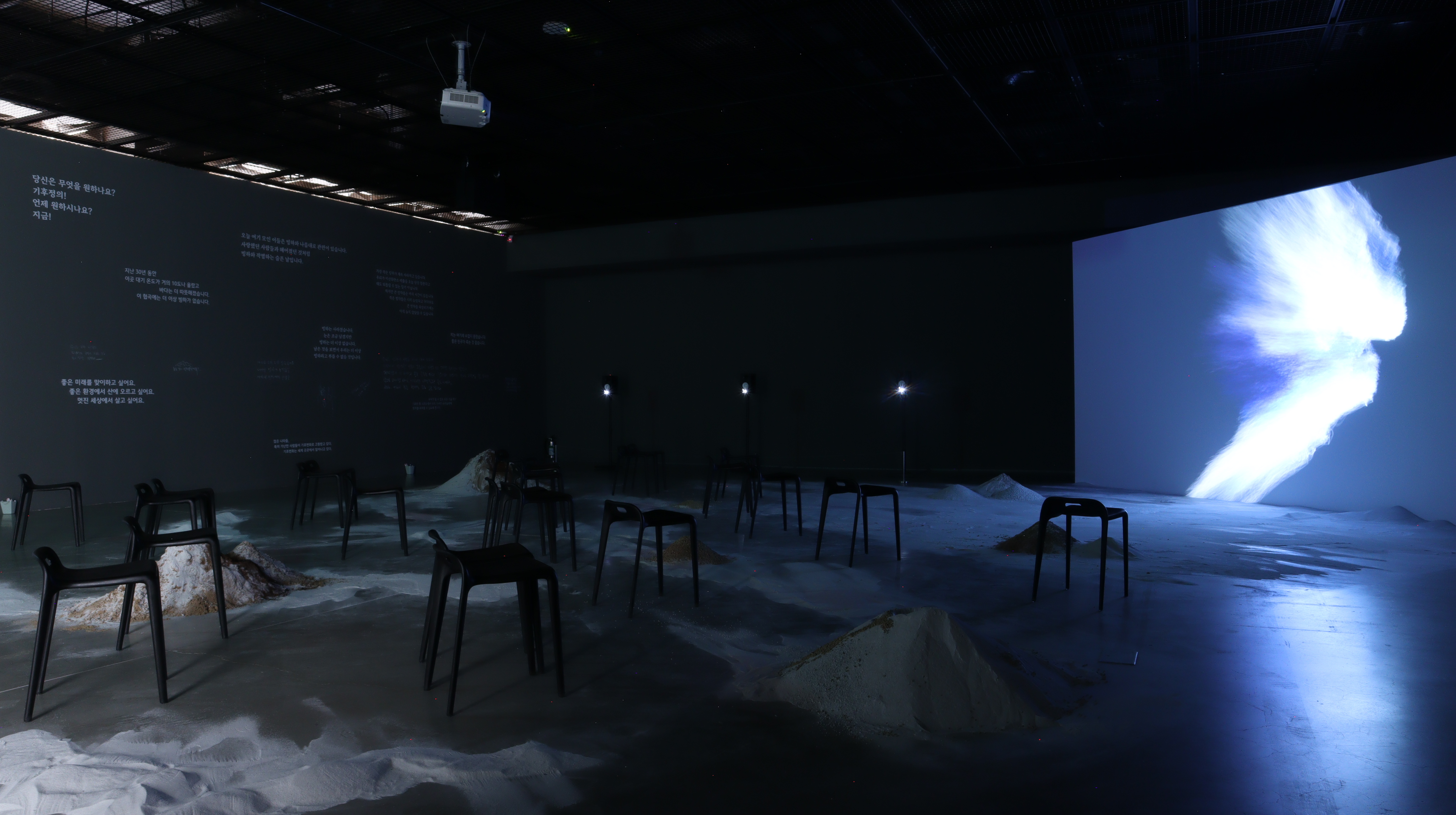 전시실에 들어서면 연극 배우의 목소리에 따라 떠나간 빙하를 추도하는 과정이 시작된다. 기후 위기를 악화시키는 전쟁, 도시화, 산업화를 상징하는 소리 그리고 기상이변으로 인한 비, 천둥소리 등이 뒤섞인 사운드 작품을 감상할 수 있다.