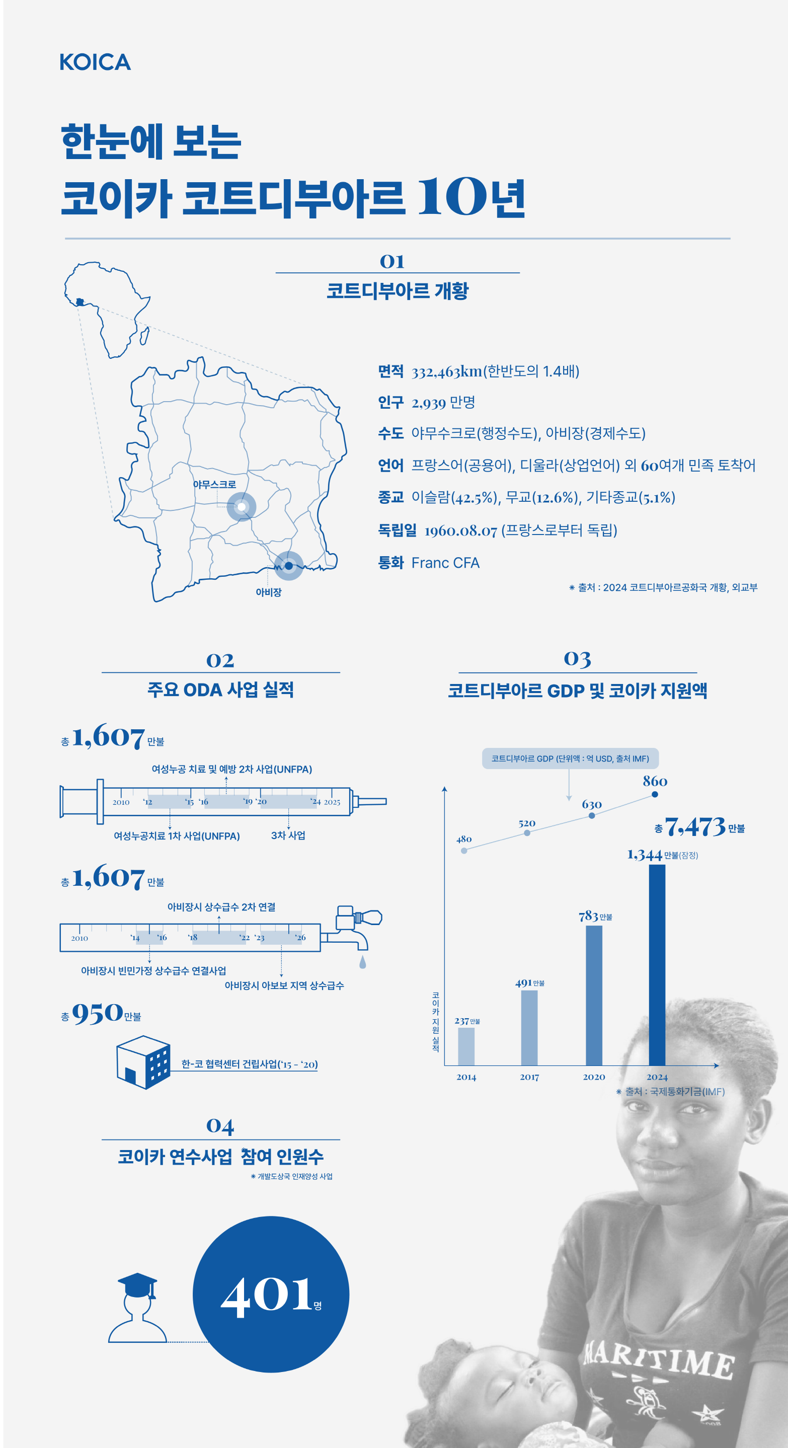 지난 10년간 코이카가 추진해 온 보건, 물 관리, 교육 분야의 공적개발원조(ODA) 사업은 코트디부아르 국민들이 과거 내전의 상처를 딛고 더 나은 미래를 꿈꾸게 하는 자양분이 되고 있다.