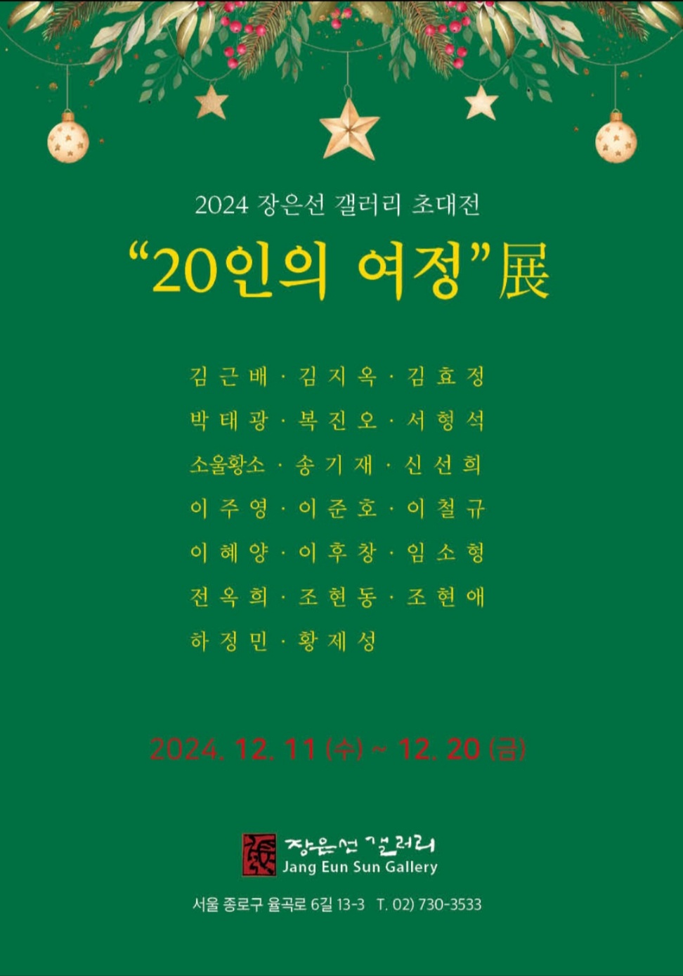 미술계에서 중추적인 역할을 하시는 선생님부터 이제 왕성하게 작업을 하는 40대 젊은작가들까지 서로 마음의 울타리가 되는 올해 "20인의 여정"전시에 많은 응원 바란다.