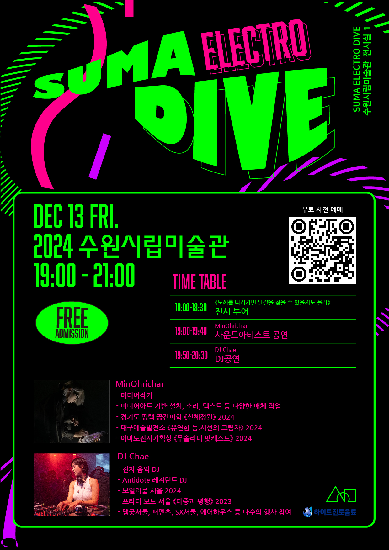 이어서 7시에 'SUMA 일렉트로 다이브'의 첫 공연인 미디어아트 기반 설치, 소리, 텍스트 등 다양한 작업을 선보이는 사운드아티스트 MinOhrichar의 퍼포먼스와 전자 음악 DJ로 활발히 활동 중인 DJ Chae의 디제잉 공연이 진행된다.