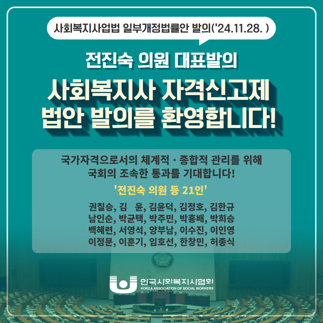 이번 개정안을 대표 발의한 국회 보건복지위원회 전진숙 의원(더불어민주당, 광주 북구을)은 “사회복지사는 우리나라 복지서비스의 큰 축을 담당하고 있는 전문가”라고 말하며 “이번 개정안이 사회복지사 자격의 체계적인 관리를 위한 법적 토대가 될 것이며, 사회복지서비스의 전문성과 질이 한층 강화될 것으로 기대된다”고 전했다.